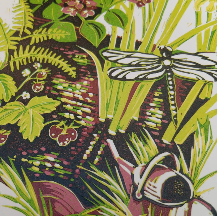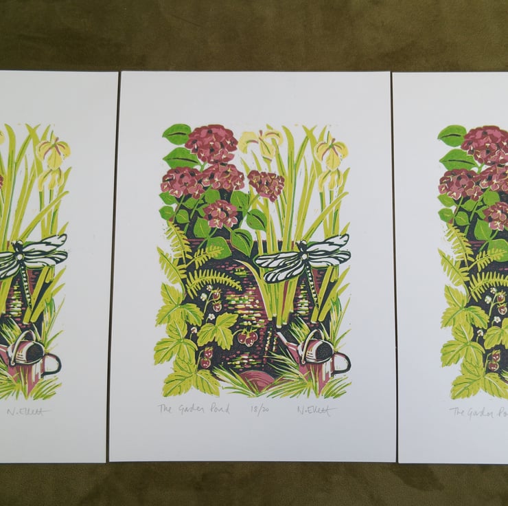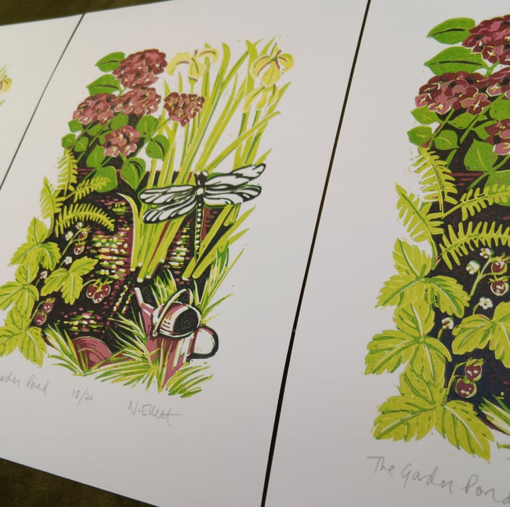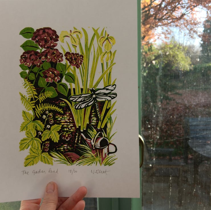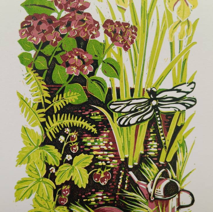 'The Garden Pond' - a six colour reduction linoprint in spring greens, rusty reds, and yellow.