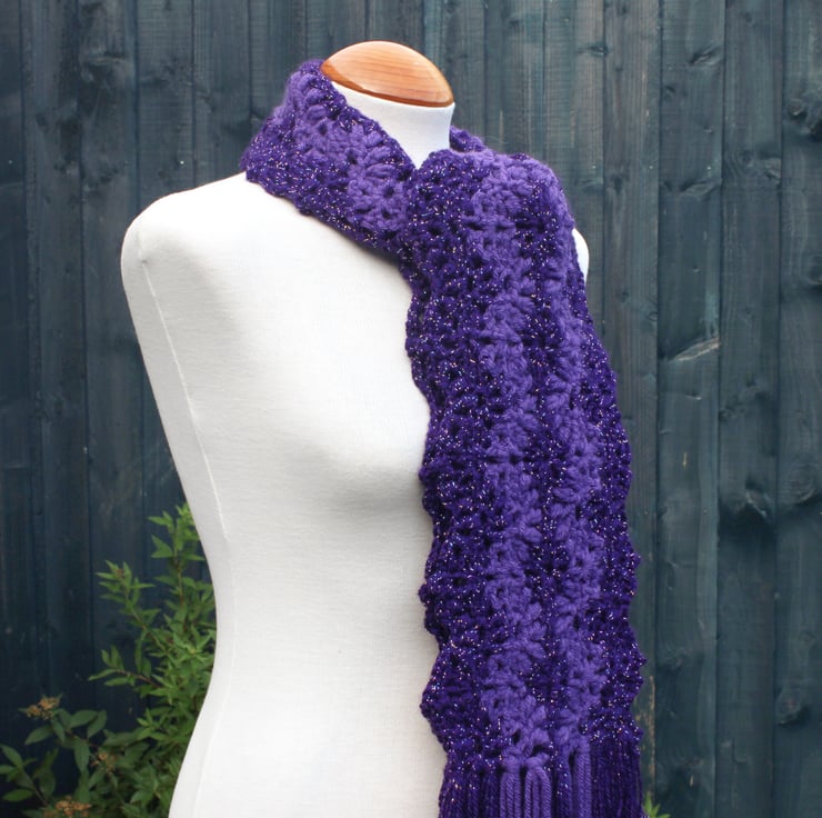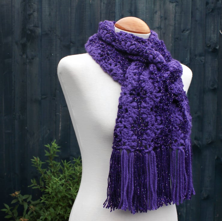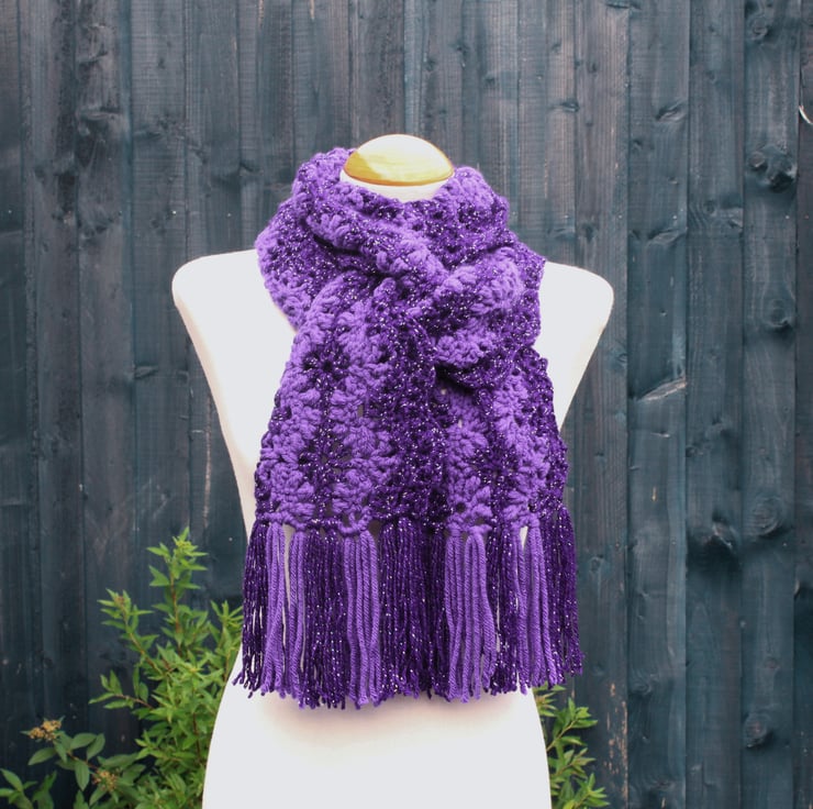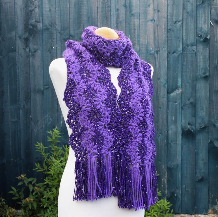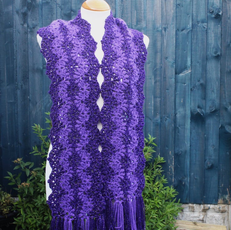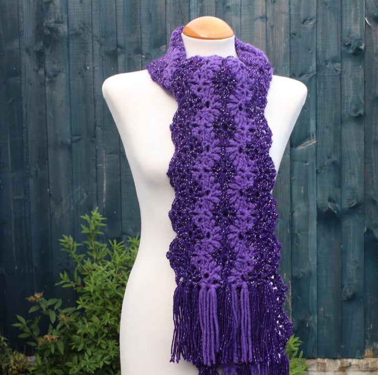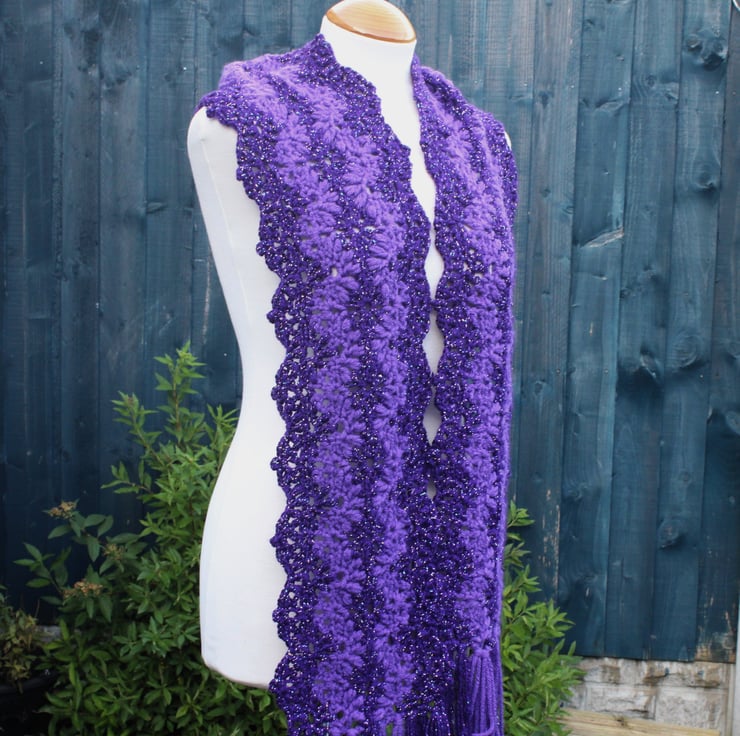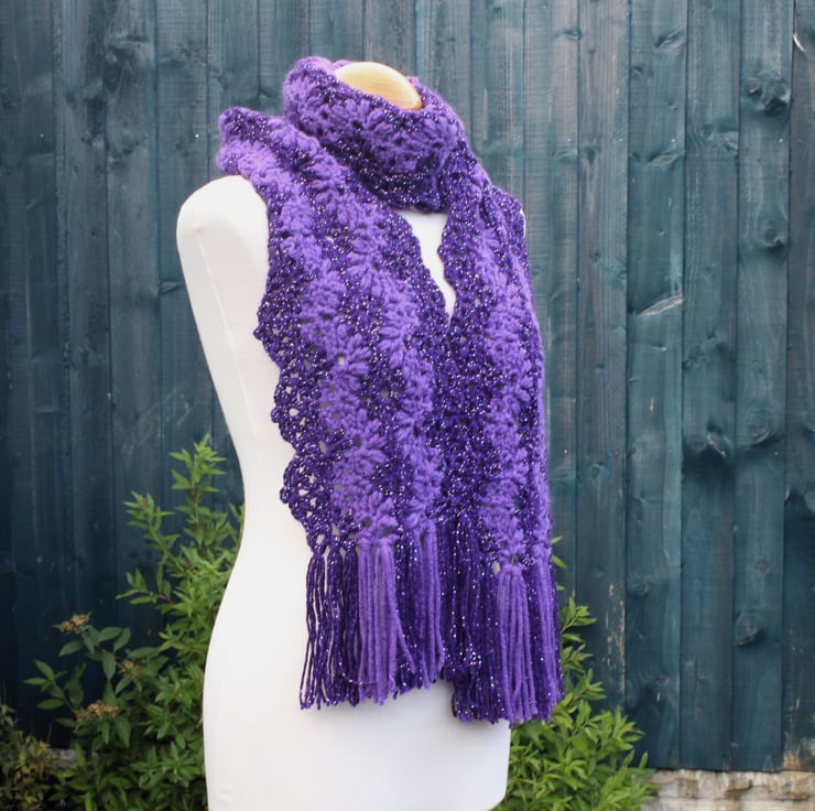 If you would like to see more photographs and read about how this scarf was made please visit my blog post about it. https://drapedinlacebyjuliablakeman.blogspot.com/2024/10/sparkly-purple-lacy-crochet-scarf.html