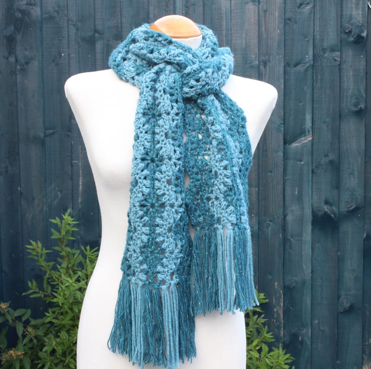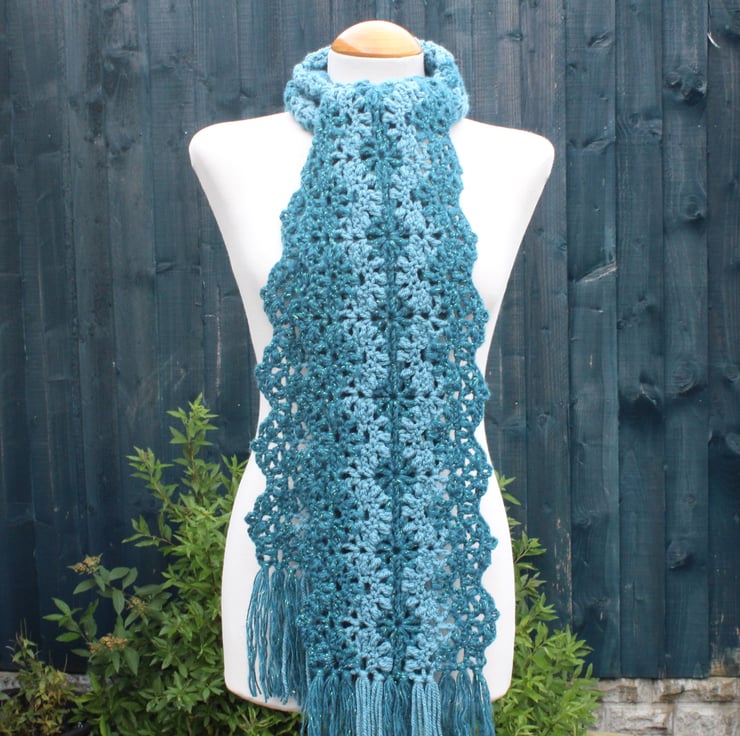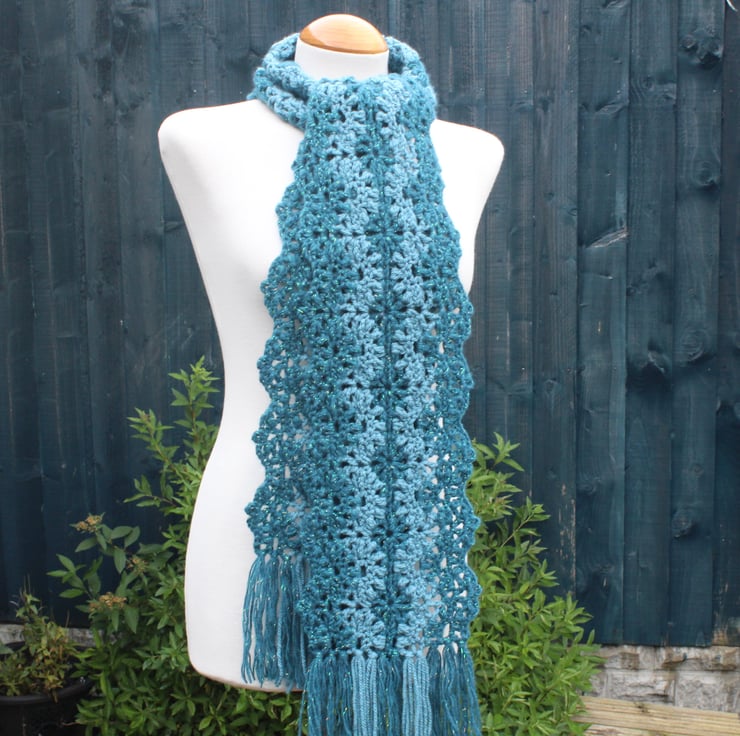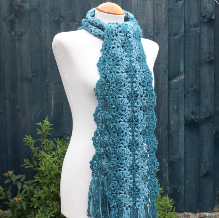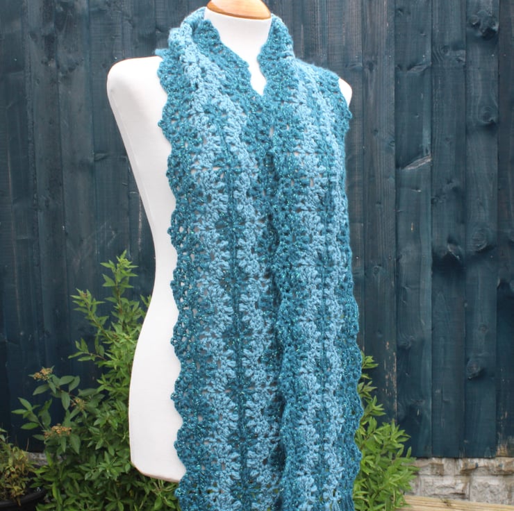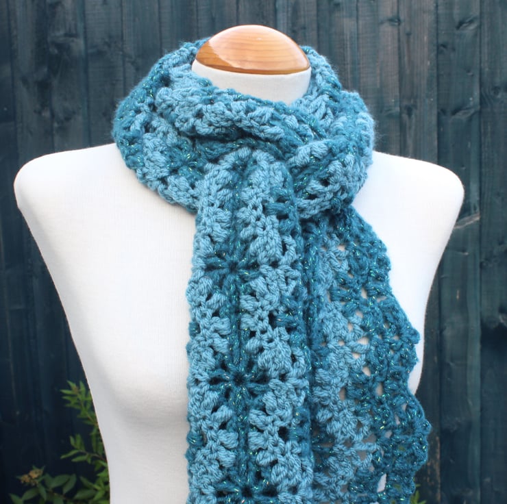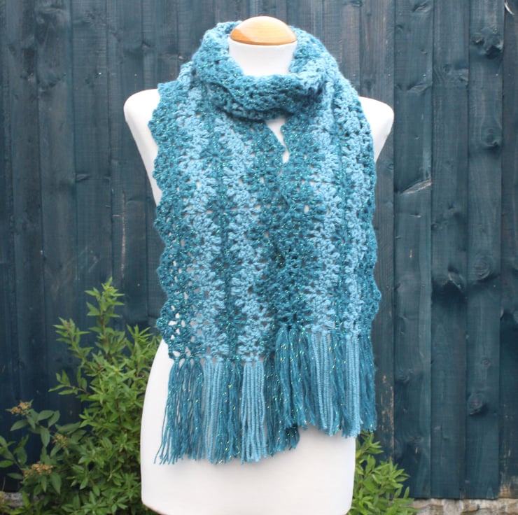 If you would like to see more photographs and read about how this scarf was made please visit my blog post about it. https://drapedinlacebyjuliablakeman.blogspot.com/2024/11/sparkly-teal-and-storm-lacy-crochet.html