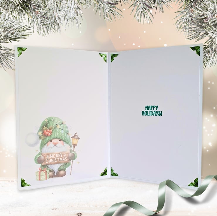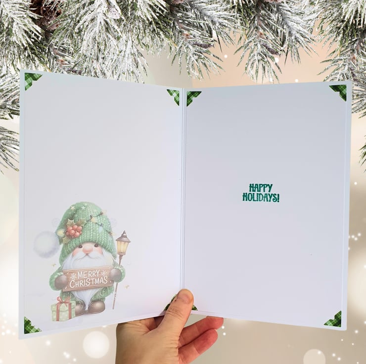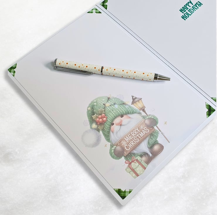 One of a kind, handmade Christmas card, with a cute gnome in a snowy landscape, dressed in a green knitted outfit & holding a wooden sign that reads "Merry Christmas"! Perfect for sending your Christmas wishes to a friend, colleague, neighbour or relative!