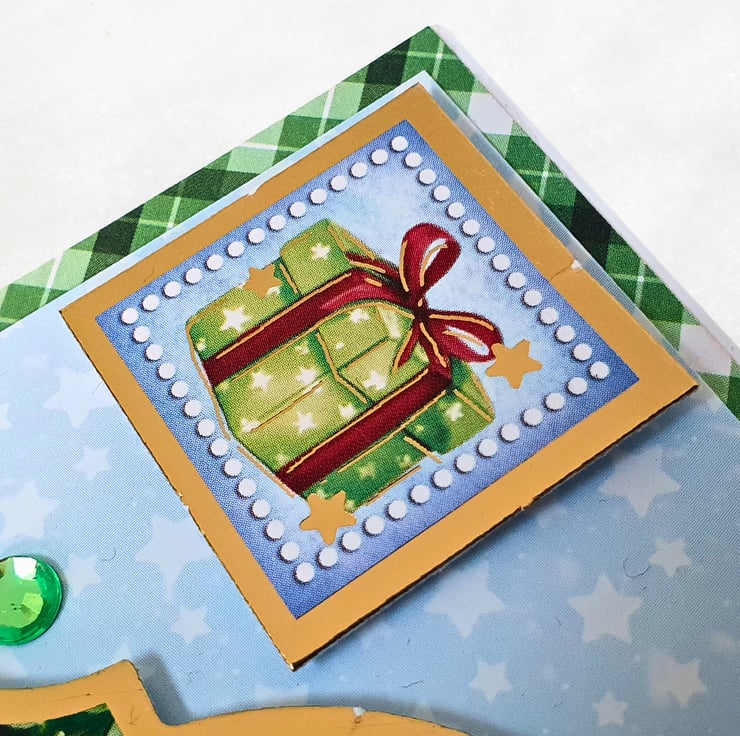 The card consists of mats of luxury paper in green tartan print & printed cardstock in light blue. The main topper lays in the middle, surrounded by a matching frame & is raised for dimension. There is a small square topper on the top left corner showing a green present box, with the sentiment "Especially For You At Christmas" on the bottom right corner. The card is adorned with green diamante. It is finished with coordinating inserts, stamped with the message "Happy Holidays" in green. It is bordered with matching, decorative photo corners.