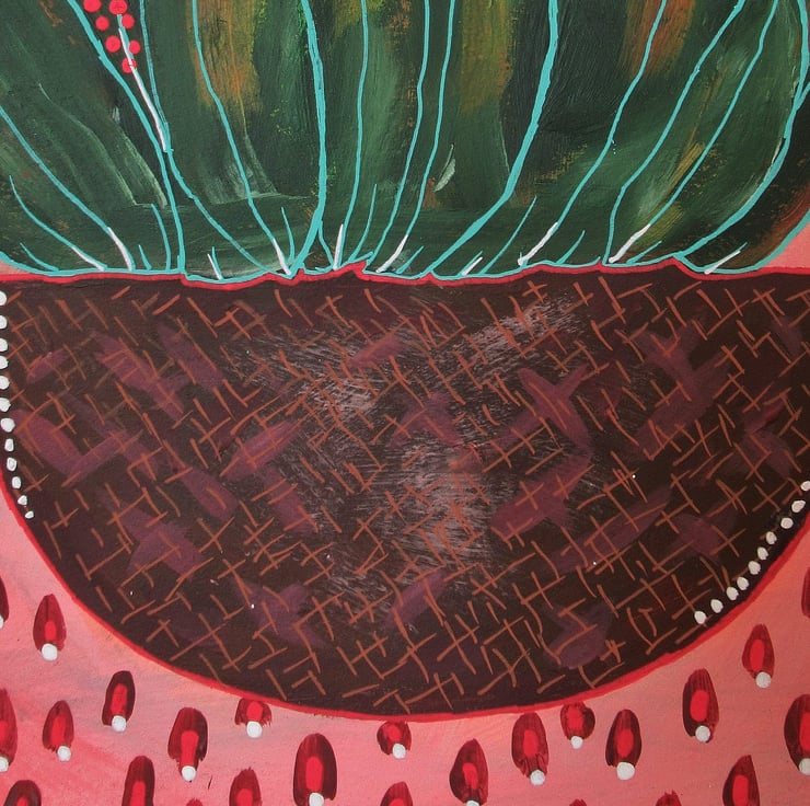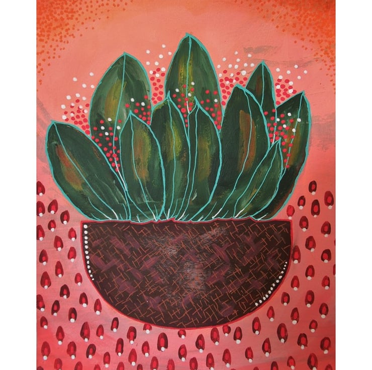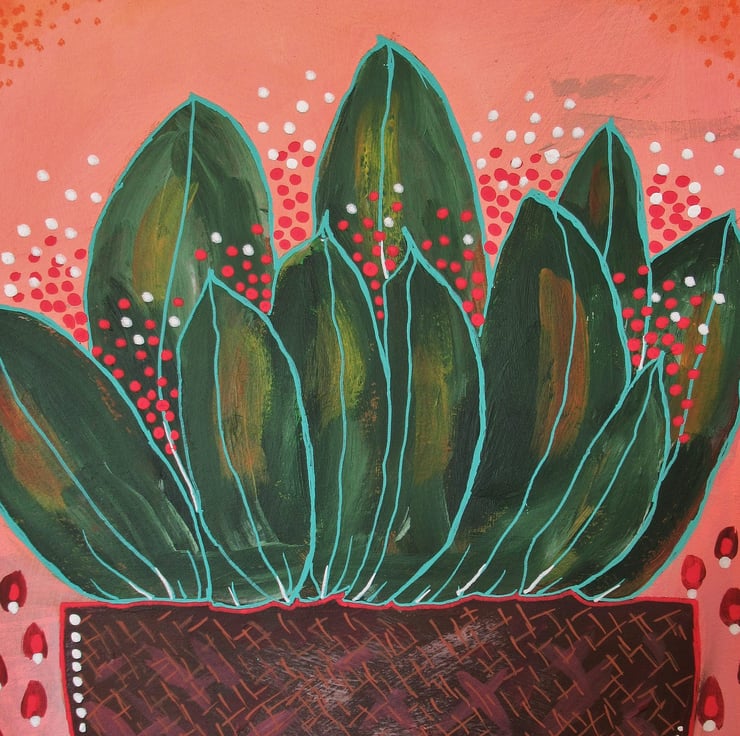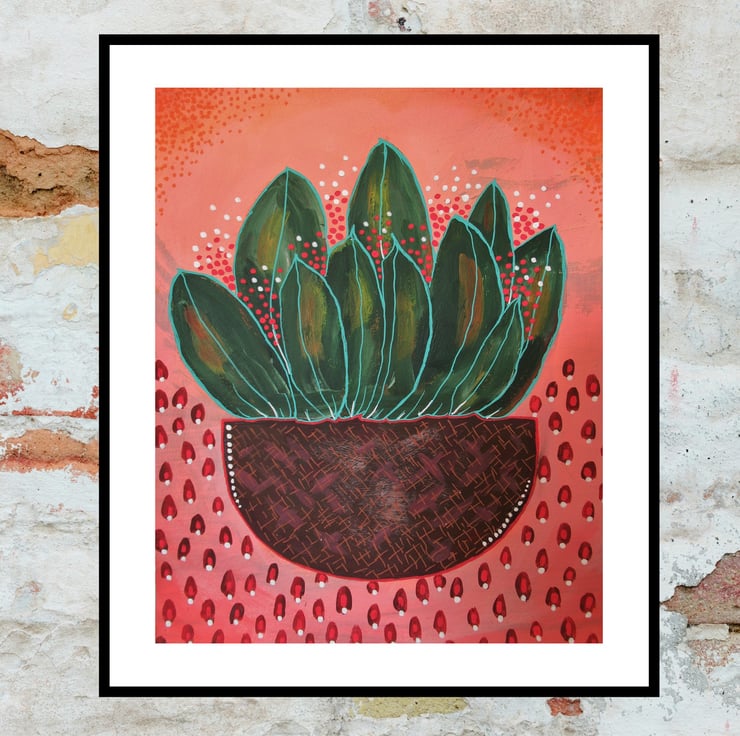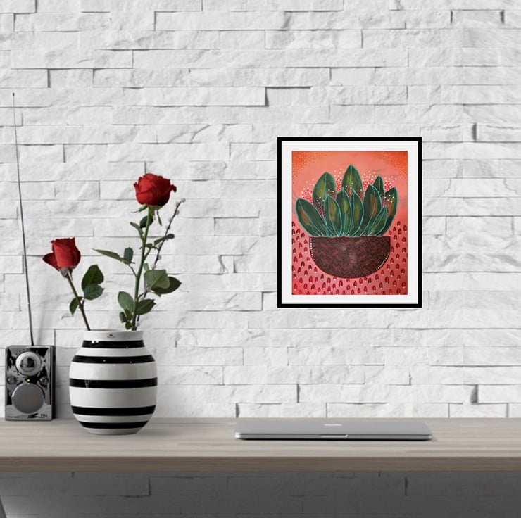 Charming original still life painting, combining acrylic & drawing pens on heavy paper. Measuring 9 x 11 inches, this plant with green leaves is expressive, quirky and colourful. The perfect size to slip straight into any standard 9 x 11" frame or mount. An attractive, naive style, the painting will be signed in the front by Bea before shipping. (Framed photos for illustration purposes only.)