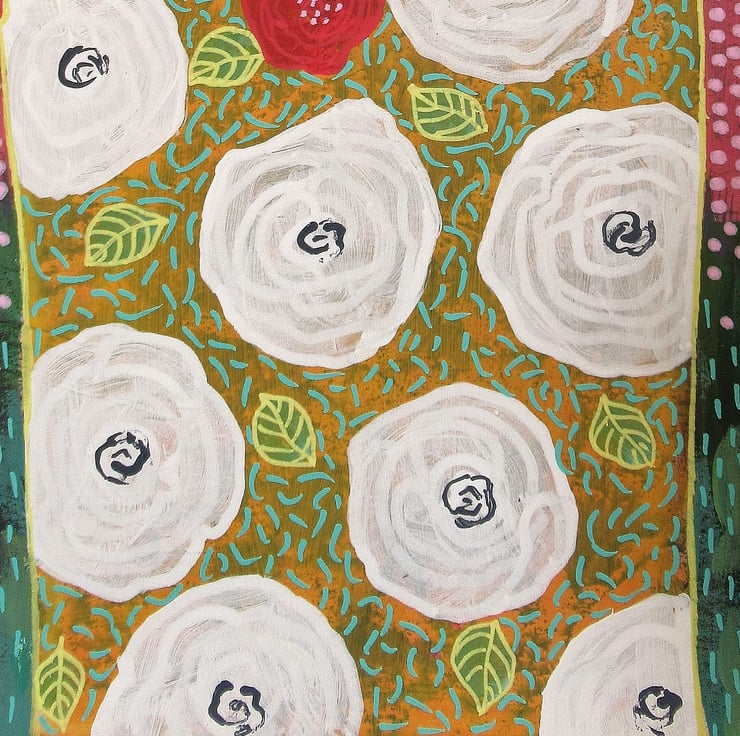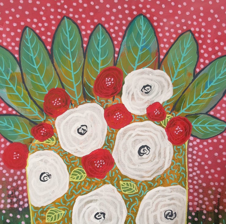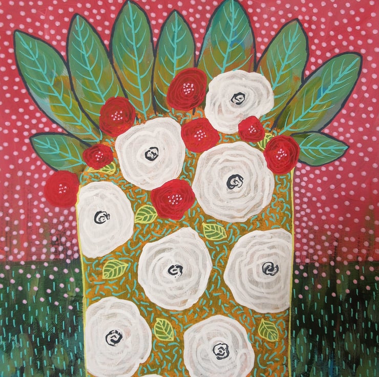 Quirky, colourful and uplifting. floral / botanical / still life painting in a combination of acrylic & drawing pens on heavy paper. The artwork measures 9 x 11 inches; perfect to pop straight into any standard sized 9 x 11" frame or mount. This gorgeous artwork will be signed in the front by Bea before shipping and it has a soft sheen surface finish. (Framed photos for illustrative purposes only.)