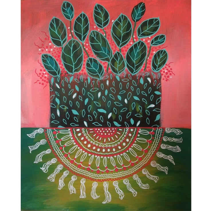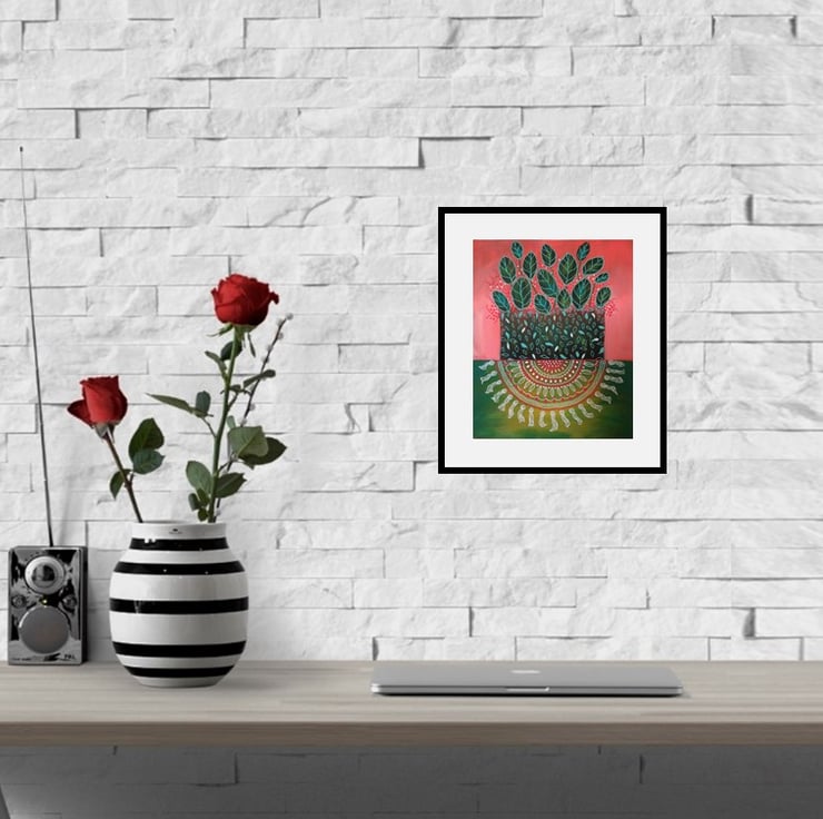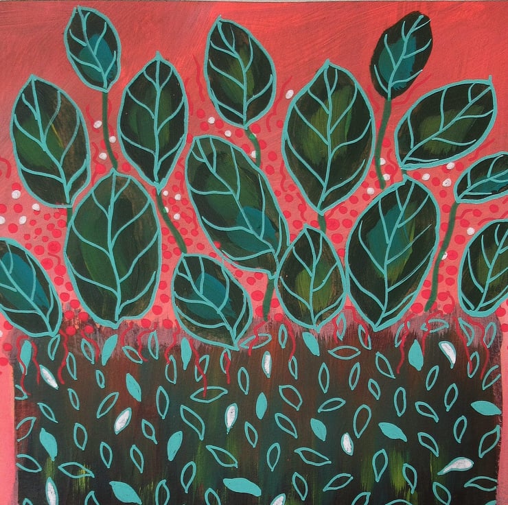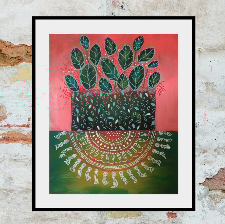 Beautifully vibrant abstract leaves / houseplant painting in acrylic and drawing pens on 9 x 11 inch heavy paper. Expressive, original artwork which will slip easily into any standard sized 9 x 11" frame (or mount.) This gorgeous painting will be signed in the front before dispatch and it has a soft sheen surface finish. (Framed photos for illustration purposes only.)