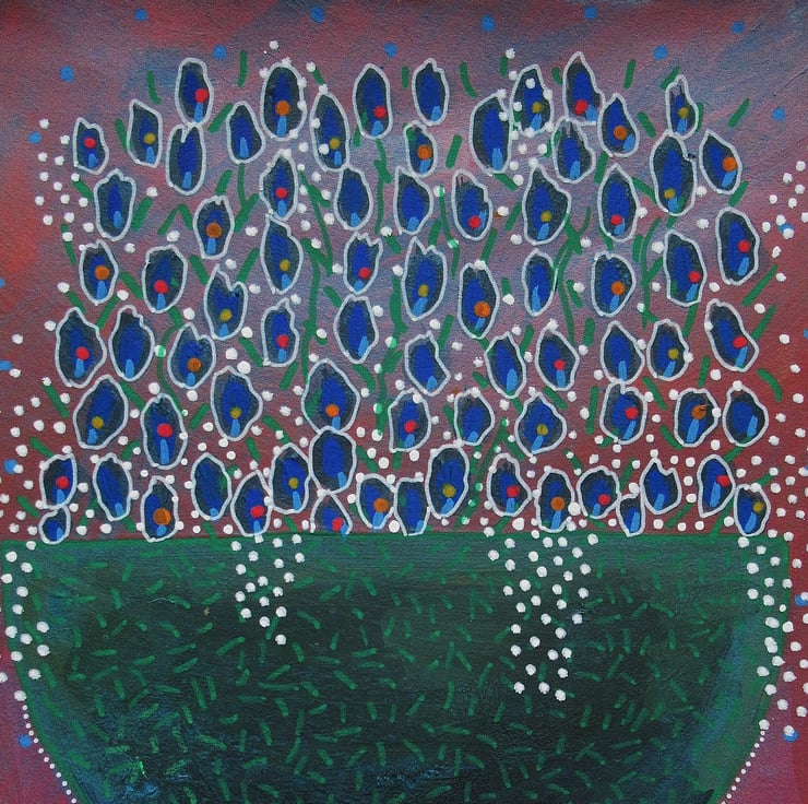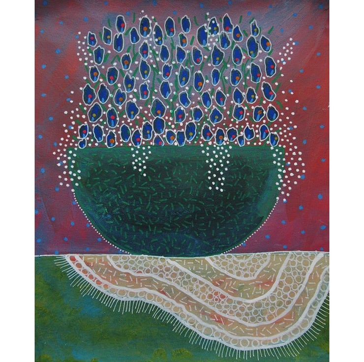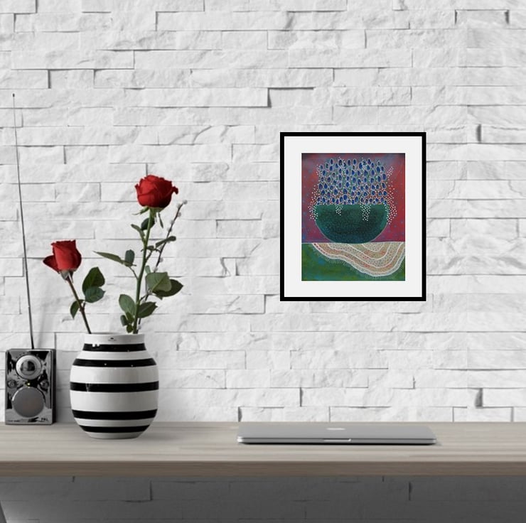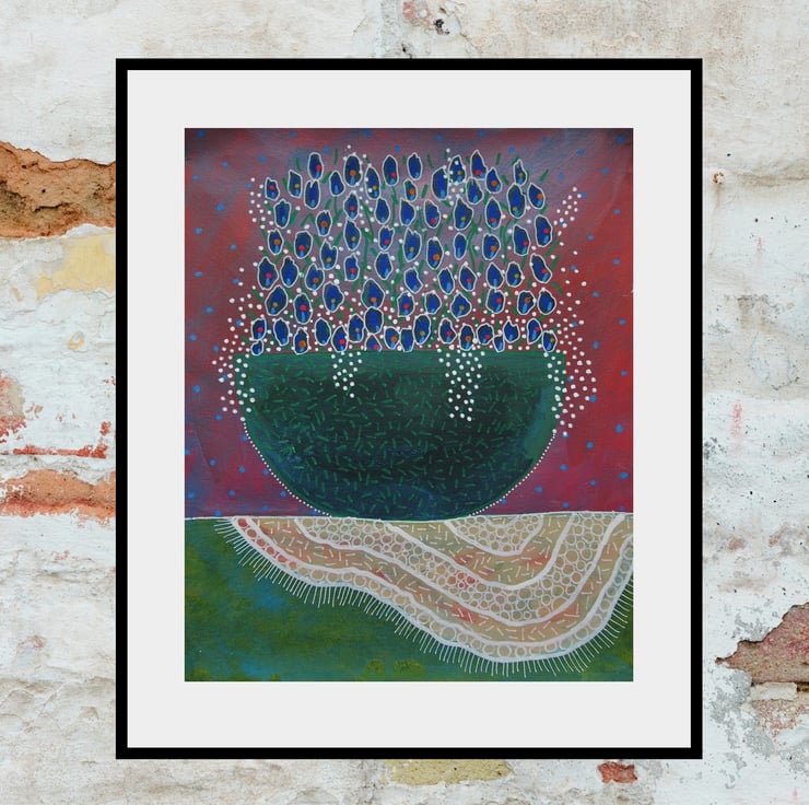Acrylic paint & drawing pens combine in this charming, naive, abstract floral still life of tiny blue flowers in a bowl. It measures 9 x 11 inches on heavy paper and is expressive and quirky. An original artwork which will pop straight into any standard 9 x 11" frame or mount. It will be signed in the front by Bea before shipping. (Framed photos for illustrative purposes only.)