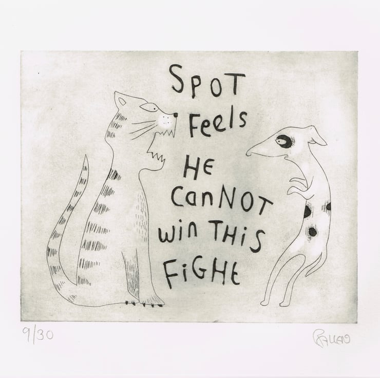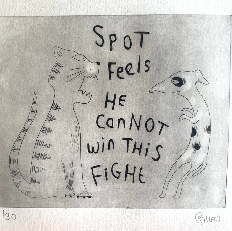 This is a little bit of silliness. This print is a limited edition dry point etching and this is no. 9/30. It’s printed on slightly cream watercolour paper with Akua black ink. It’s 23.5cm x 20cm and the etched area is 18cm x 14.5cm.