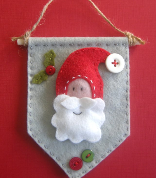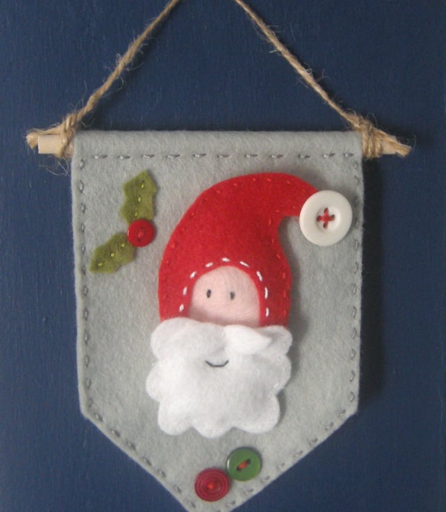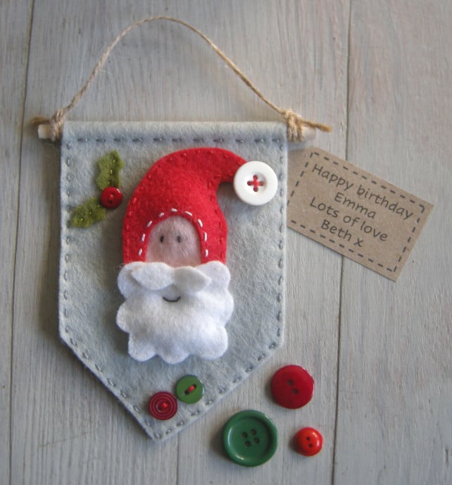 A cute handmade felt christmas Santa banner/decoration which can be personalised with a message on the tag. Brighten up your walls for christmas with this cute decoration.