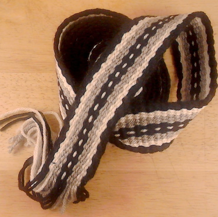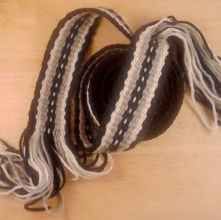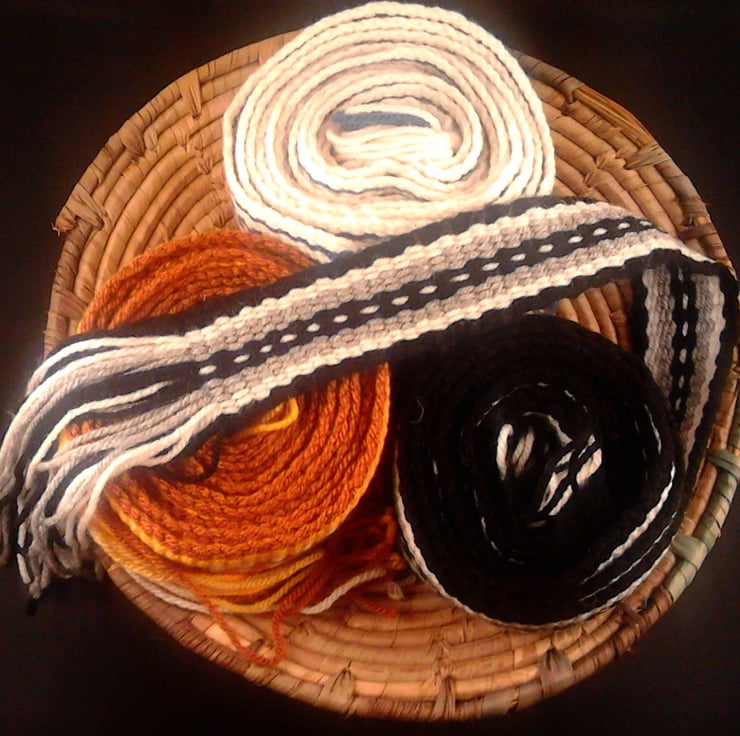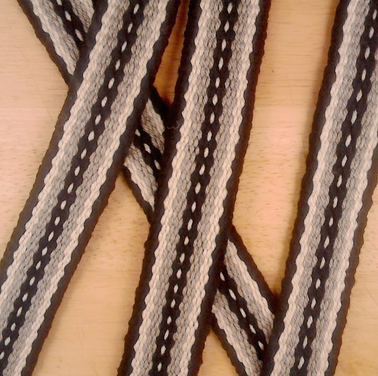 I use a portable backstrap loom. Recently I have been weaving outdoors in Cyprus. The simple repetitive rhythm of hand weaving is gentle and meditative. Designs are drawn from Scandinavian, Irish and West African sources.