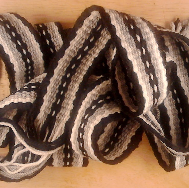 Boho wrap-around belt/strap/girdle. Mixed fibres, handwoven in West Yorkshire. Black/white/ash grey ethnic inspired pattern. Approx. 4cm wide and 250cm long.