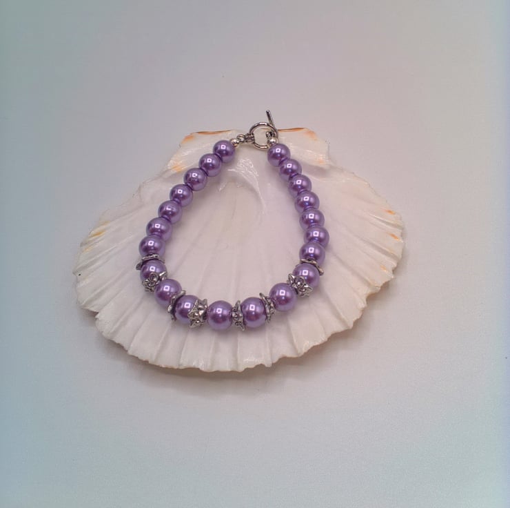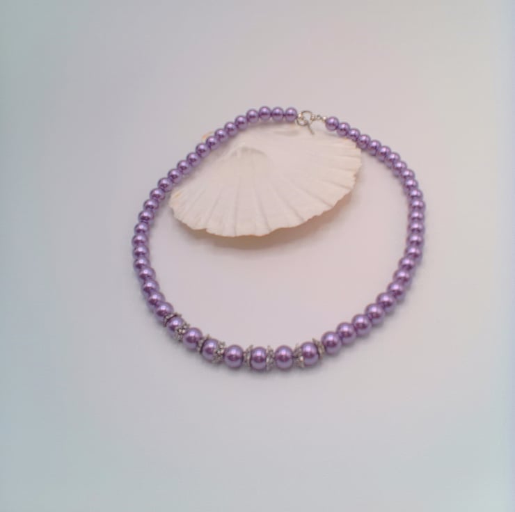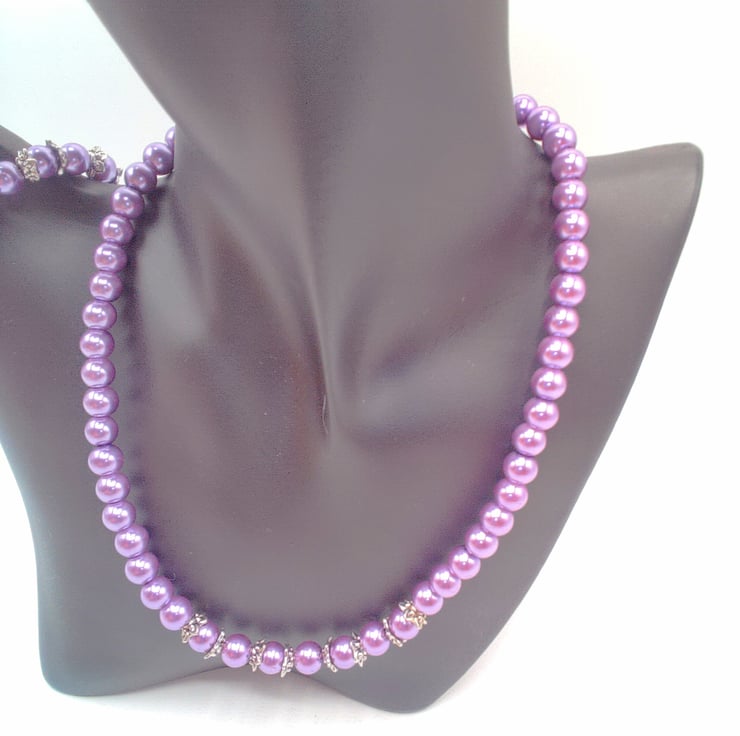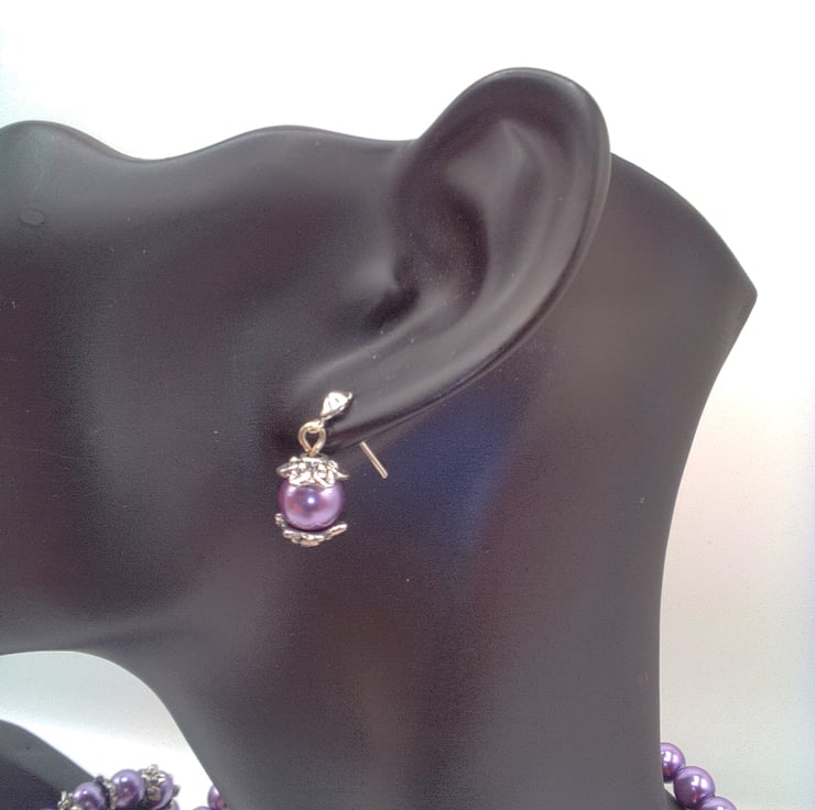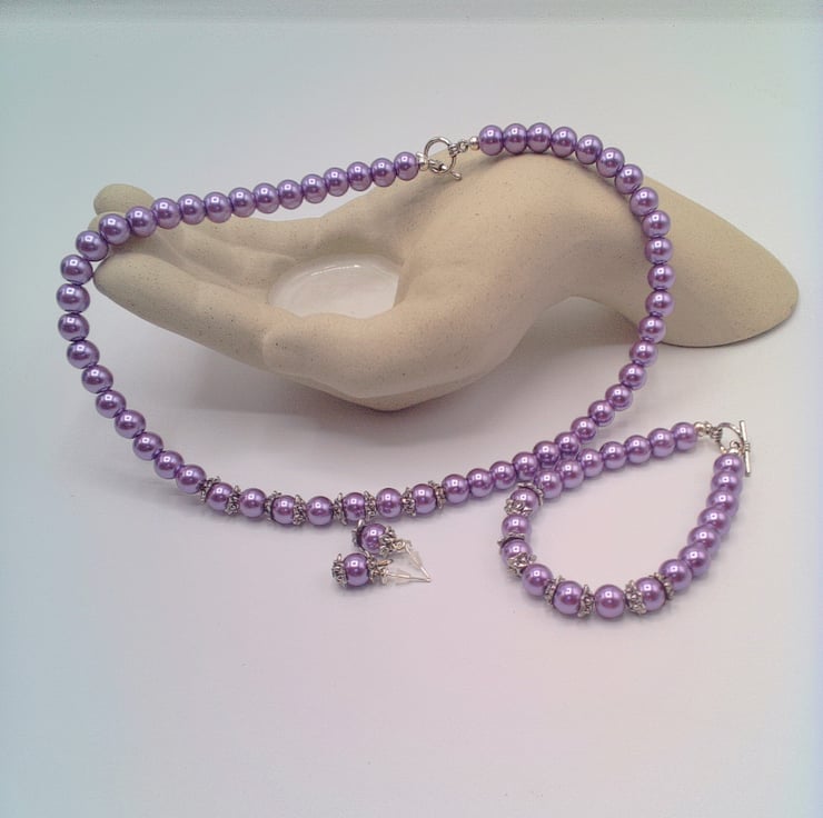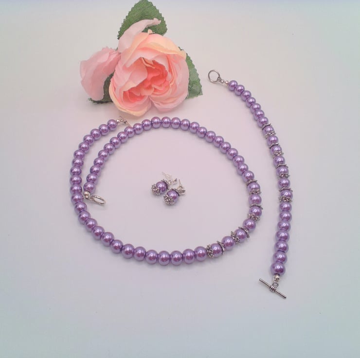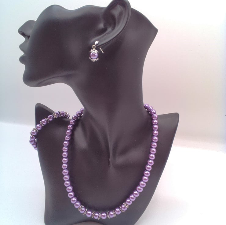 This beautiful jewellery set comprises a necklace, bracelet and pair of earrings it is light and easy to wear. It would look great with an outfit for a special occasion. The necklace is made using 8 mm Mauve Glass Pearl and Silver Plated Bead Caps. The bracelet and necklace have silver plated toggle clasps and the earrings have silver plated ear studs. The necklace is 16 inches (41 cm) in length, the bracelet is 6.75 inches (17 cm) long and the earrings have a drop of 0.75 inches (1.8 cm). The jewellery set will be dispatched wrapped in tissue paper in an organza bag and delivered to you via Royal Mail first class post. This pretty set would make a lovely gift for a lady who loves pearls.