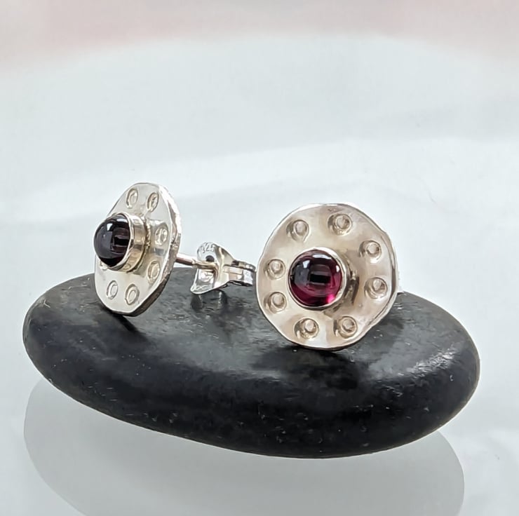 Recycled Sterling Silver Garnet Textured Disc Stud Earrings