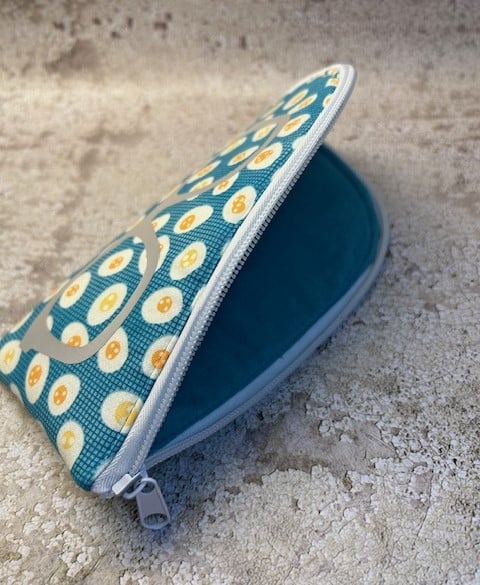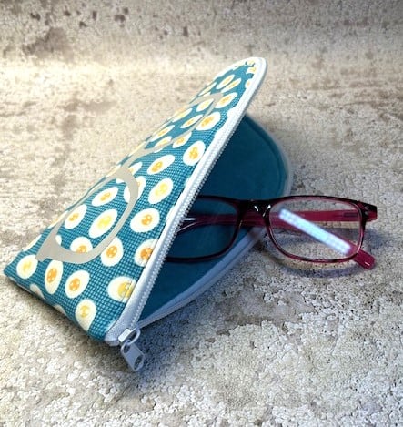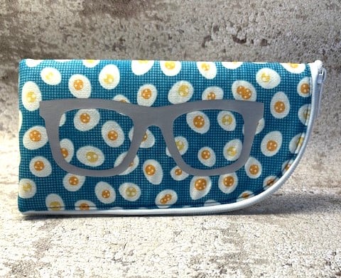 Handmade, unique zip up glasses case made with funky fried egg 100% cotton fabric, lined with a co-ordinating light teal cotton, enhanced with a vinyl glasses decal. The case is padded with a foam interlining and the zip opens from top to bottom, enabling easy access to the glasses.