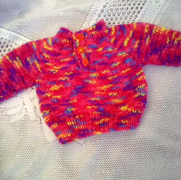 The sweater is in stock in this variegated pink coloured yarn to fit a 14 inch chest, a newborn baby. It would make an ideal gift for a baby shower, a new baby or as a Christening gift. It would also look good on your own little one as a treat for him or her.