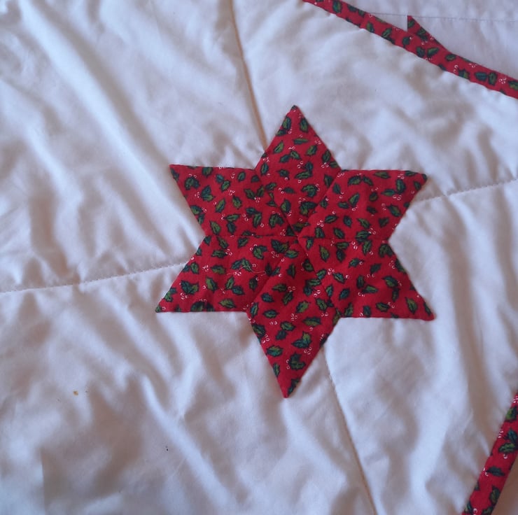 The stars are made from a vintage Christmas fabric, featuring holly sprigs on a red background. The stars are set between snowy white squares and the quilt is bound with the same holly fabric as the stars.