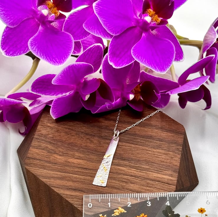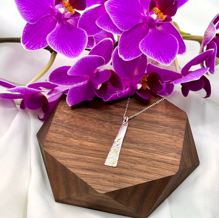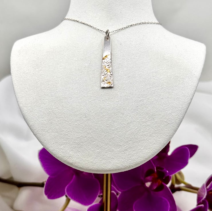 One of a kind Fine Silver and 24ct gold Necklace. I have handmade this necklace using eco-friendly silver metal clay and 24ct gold. I texture and shape the clay, refine then kiln fire. The result is solid 999 fine silver. I then fuse the 24ct gold foil to the silver using an ancient Korean gilding technique called Keum boo. The surface texture and application of the gold foil are done by hand resulting in a bespoke design.