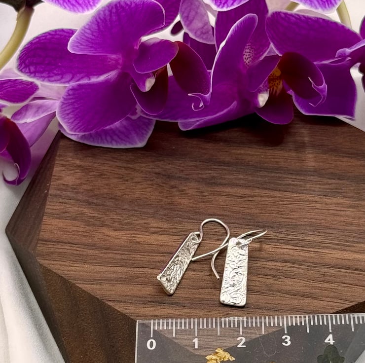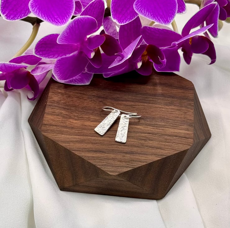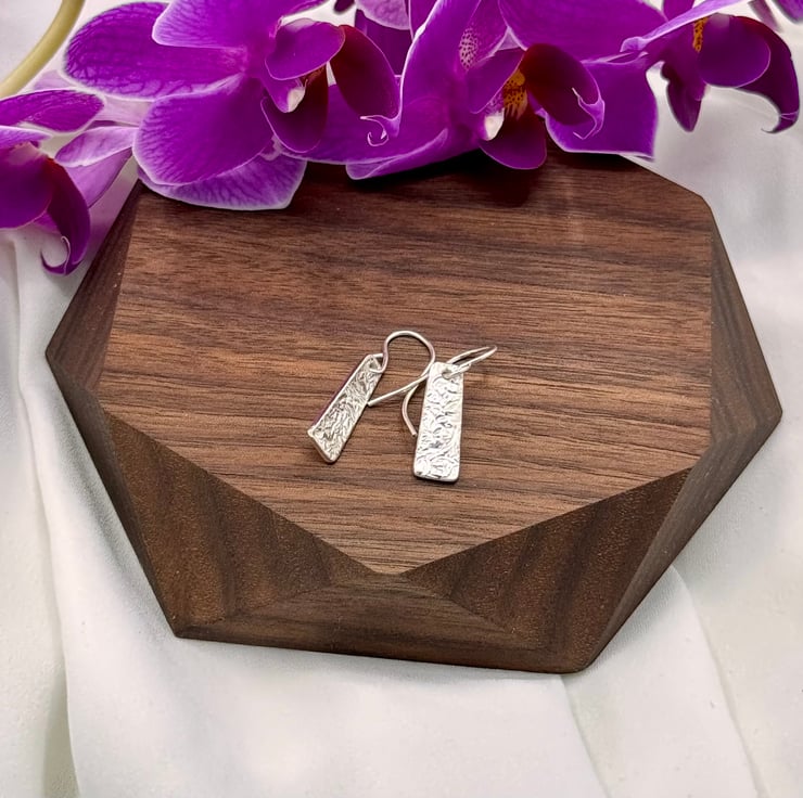 Textured silver rectangular shaped drop earrings (same texture on the front and reverse). I have handmade these earrings using eco-friendly silver metal clay. I texture and shape the clay, refine then kiln fire. The result is solid 999 fine silver.