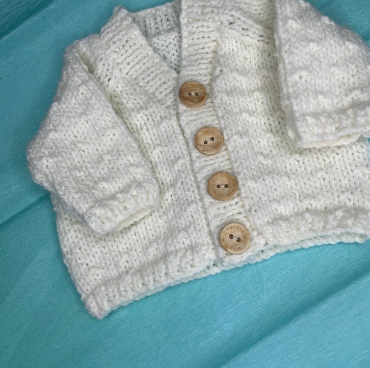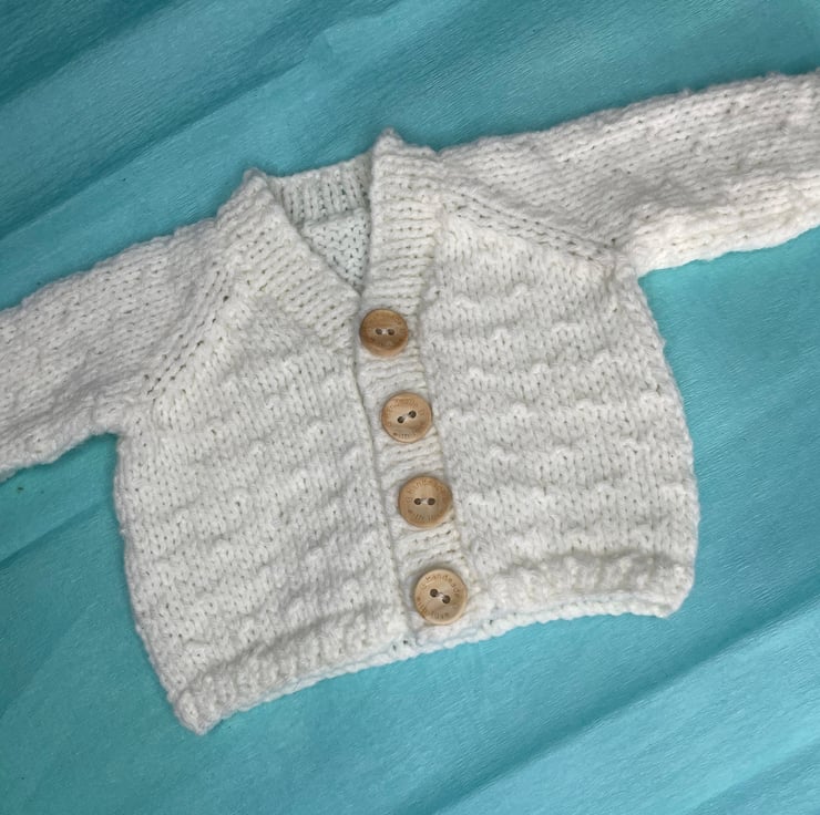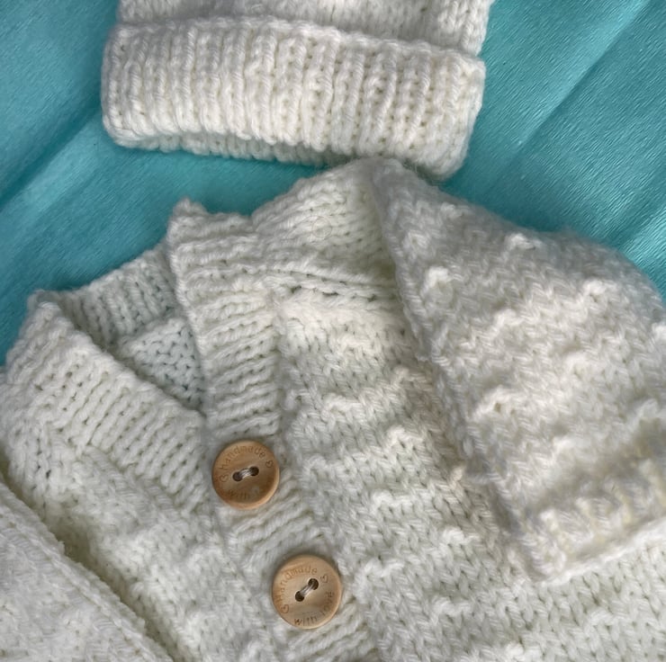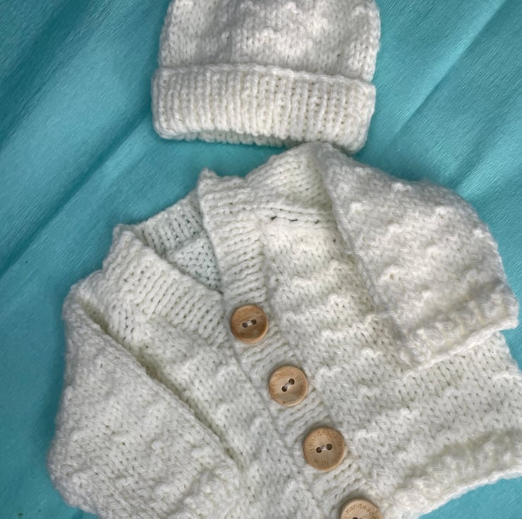 Lovely soft little cardigan and hat for a premature baby. Cardigan made to fit 12inch chest.