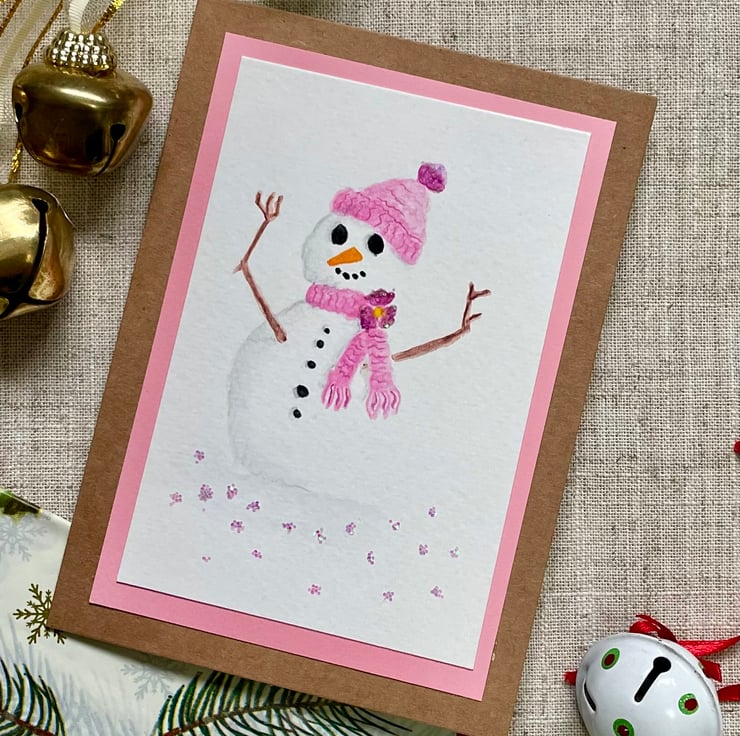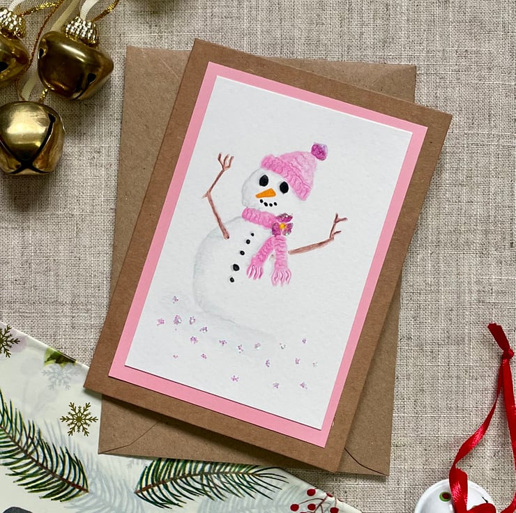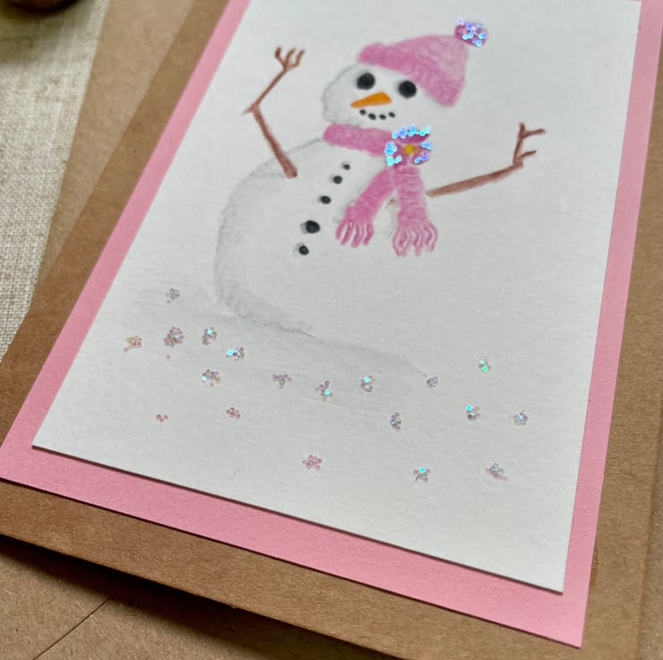 Hand painted Christmas card of a snowman/lady in complete with pink scarf and matching woolly hat, with a bit of added sparkle on the bobble and the snow covered ground.