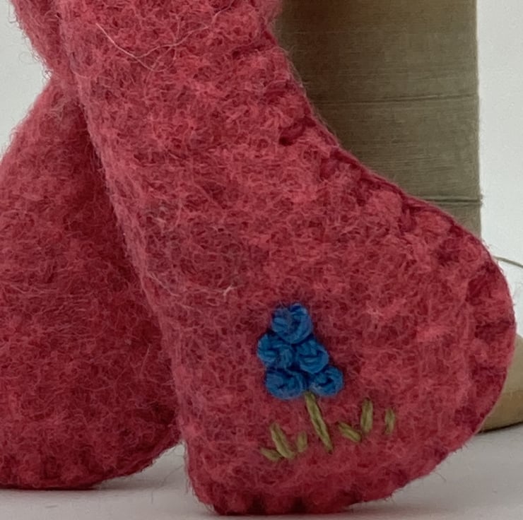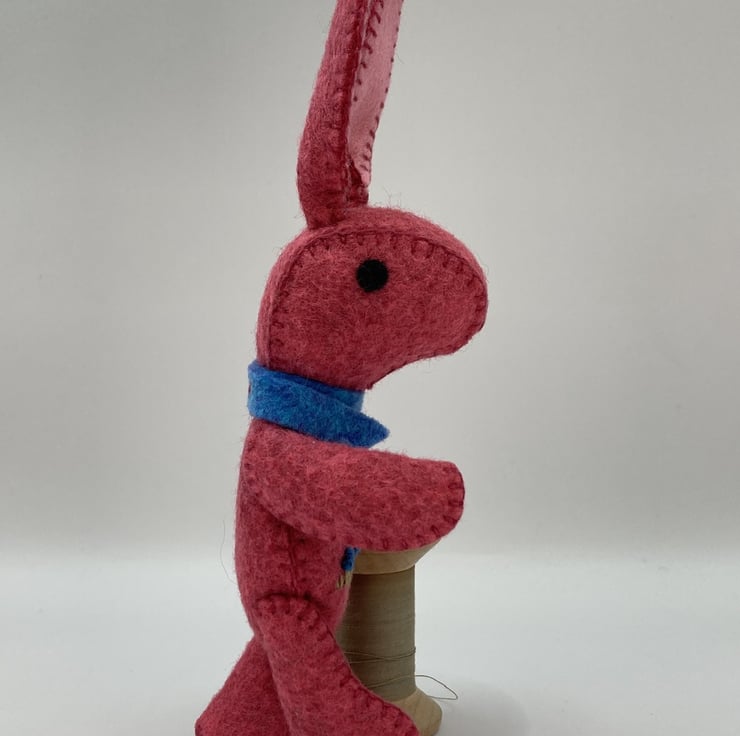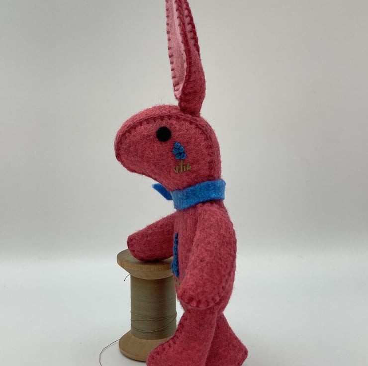 I have used raspberry heathered wool felt to make Bunny’s body which I have lovingly filled with regulation Hi-Loft polyester toy stuffing.