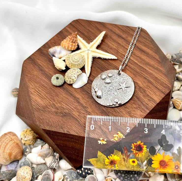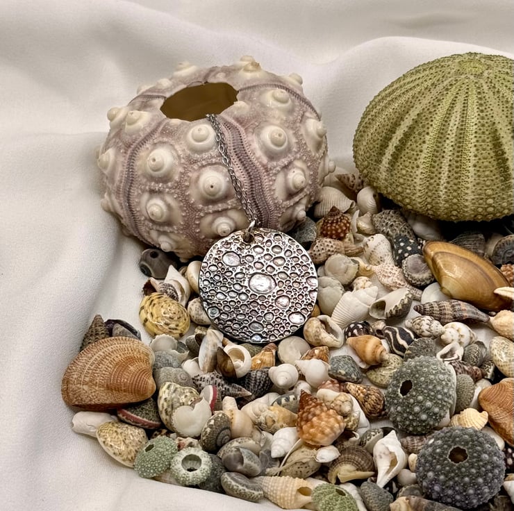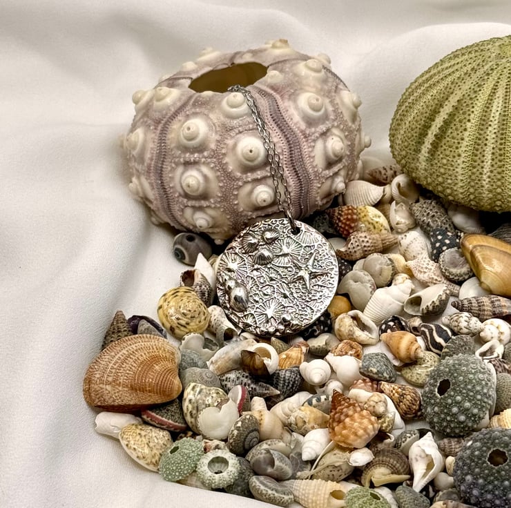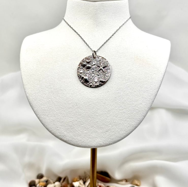 Fine Silver Necklace. I have handmade this necklace using eco-friendly silver metal clay. I texture (both front and reverse) and shape the clay, make silicone moulds of shells which I then use to make casts which I apply to the design, refine then kiln fire. The result is solid 999 fine silver. I have applied liver of sulphur to create an aged/ antique affect to the piece, add depth and make the design pop. The surface texture and application of the miniature silver shells are done by hand, resulting in a bespoke one of a kind design.