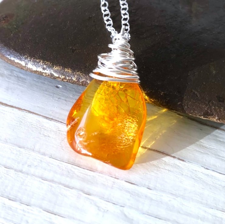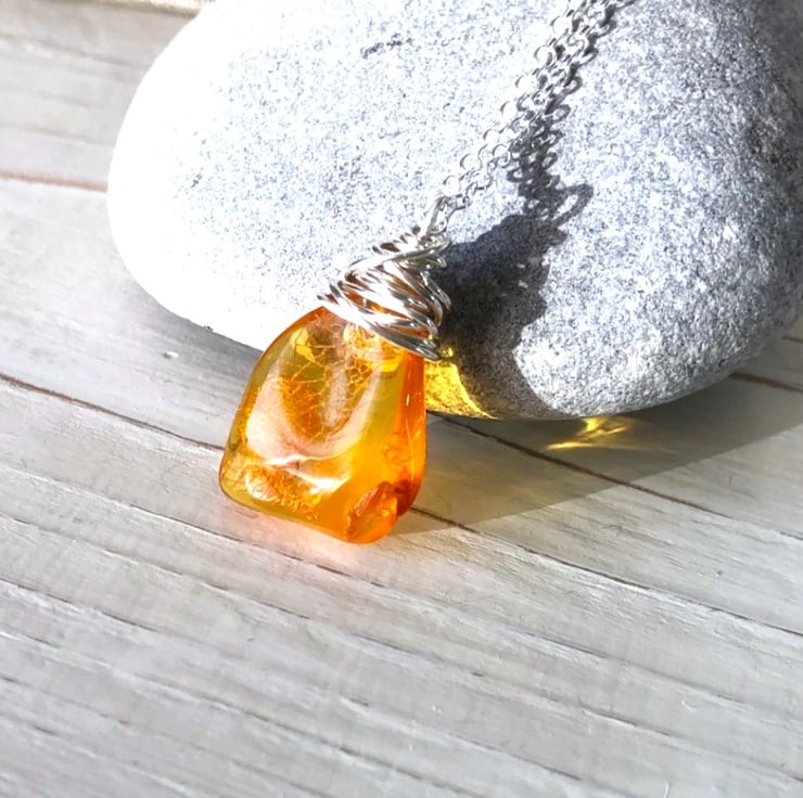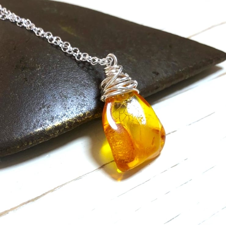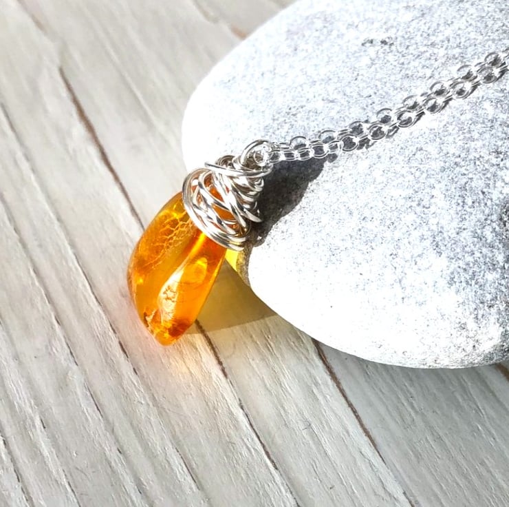 Pretty little freeform shaped amber pendant, wire wrapped in silver and hung on an 18" sterling silver chain. Makes a great little Christmas gift.