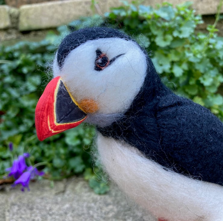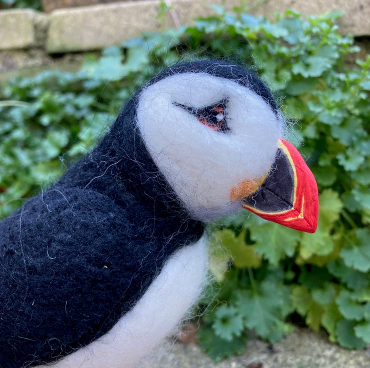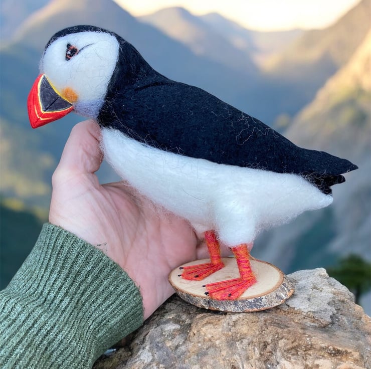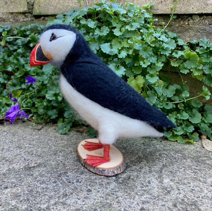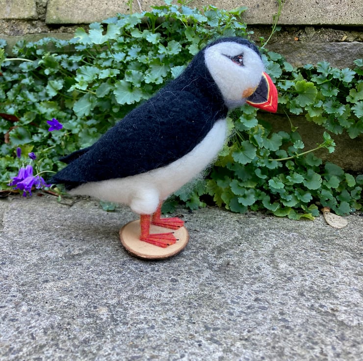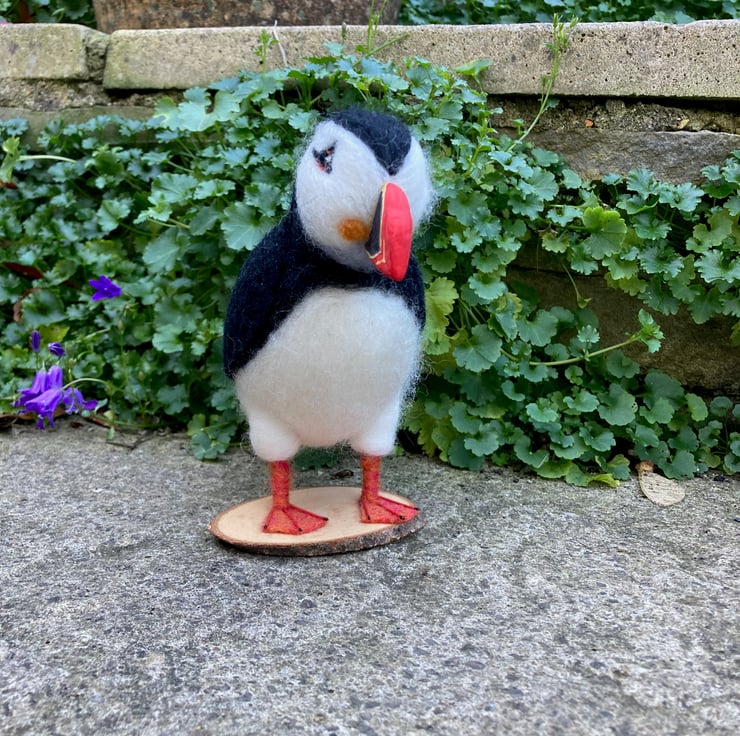 An adorable puffin needle felted from woollen fibres. A core of white wool has been sculpted into shape using a barbed felting needle and then a top coat of appropriately coloured woollen fibres has been added to create the markings. A beak made from hand coloured silk clay has been added and the wings, cut from flat felt sheets, have been needle felted into place. The puffin has been mounted on a small rustic wooden slice to aid stability.
