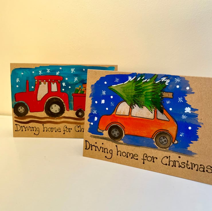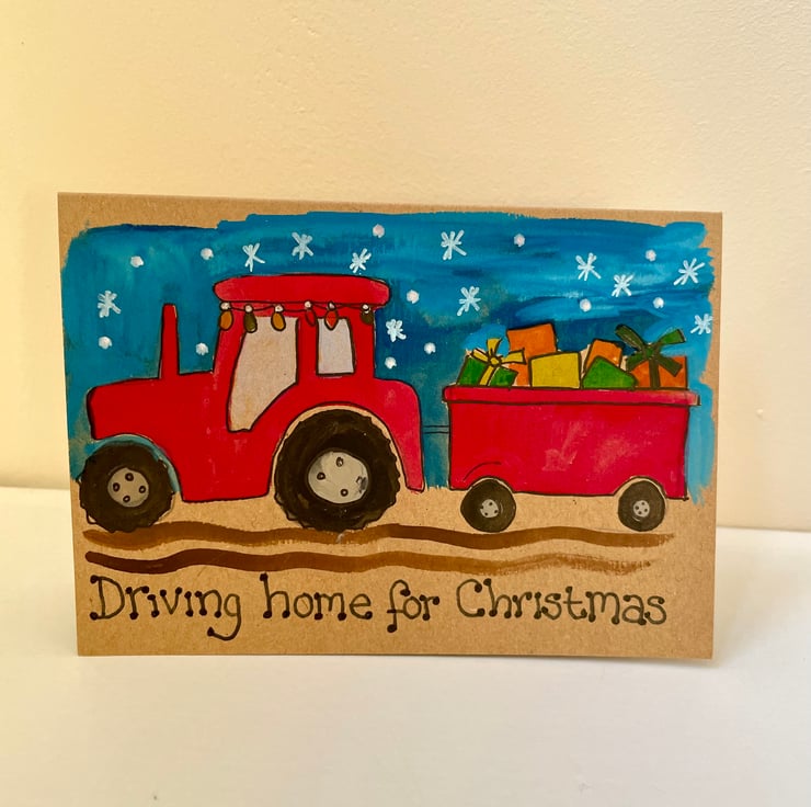 A cute hand painted card for the tractor fan in your life.This individually made card is sure to make someone smile. An alternative Christmas card made using a recycled card blank in a natural colour. The illustration is painted directly on the card, and no two will ever be the same. Whether it is for a farmer, or just someone who would like a tractor for Christmas this fun card is unique.
