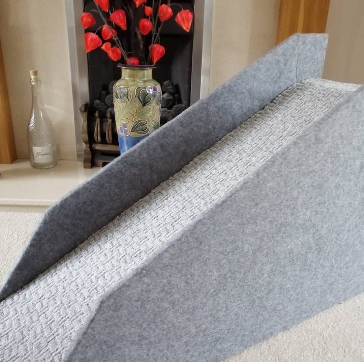 This ramp is designed to butt up to furniture or a sofa, it has raised sides to help avoid jumping, and an open back giving clear through access.