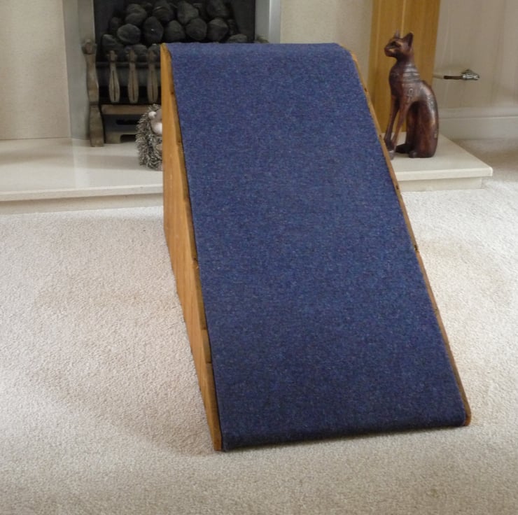 Ideal accessory for dogs/cats to gain access to their favourite couch or owners bed. An easy 30-degree slope with soft new quality carpet and a flat top, lovely quality natural wooden sides and an all screwed and glued sturdy construction, giving years of use. Great for pets with joint or medical problems or recent operation troubles. Ideal for elderly or infirm pet owners who find it difficult to lift their pet onto the couch to be beside them for company. Covered in a quality blue carpet that extends up the ramp and over the top and down the back, giving a pleasing appearance. No more small dog jumping from a high couch to the floor, with possible damage to hips etc.