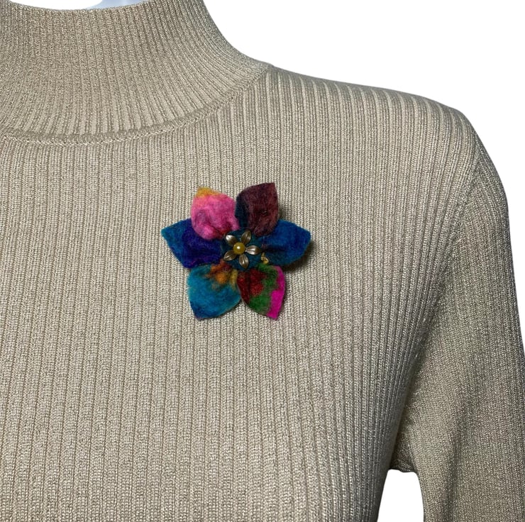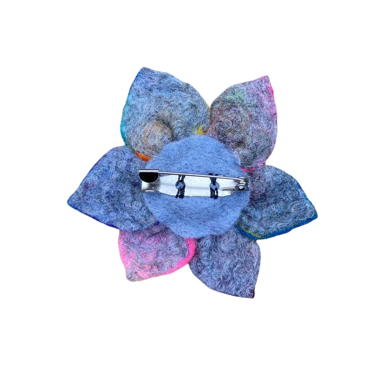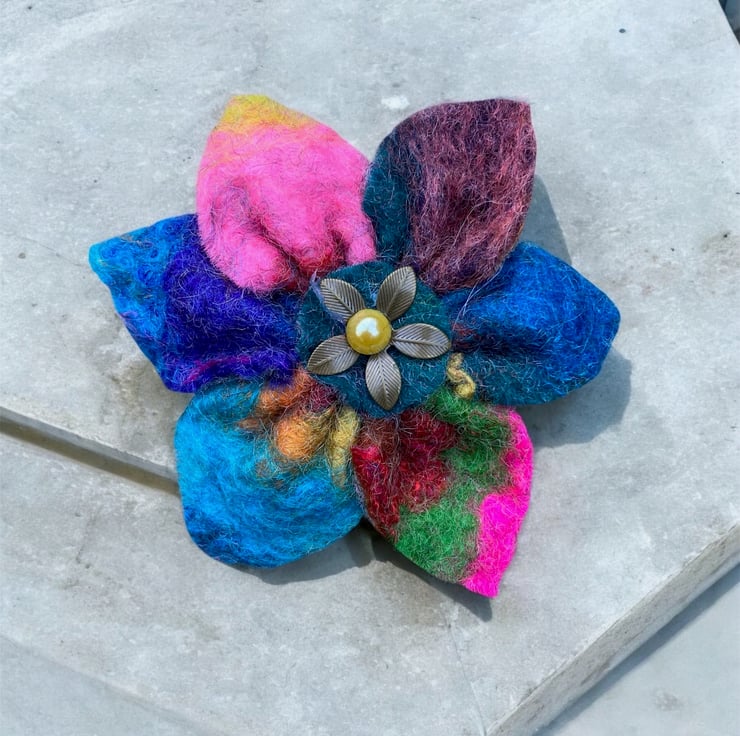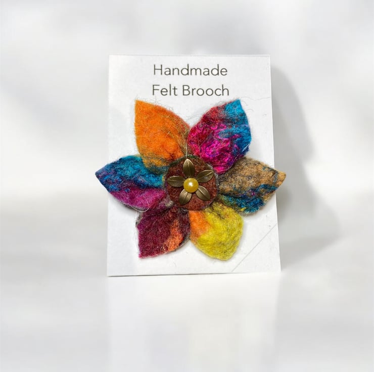 This beautiful bright flower brooch will brighten up any outfit. Made using a piece of multicoloured felt which hand felted using brightly coloured wool and silk fibres,The fllowers are formed with six pointed petals and a central antique brass effect stamen and golden yellow acrylic half pearl is then added. A silver tone brooch pin has been securely attached to the reverse.