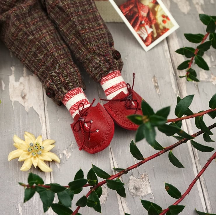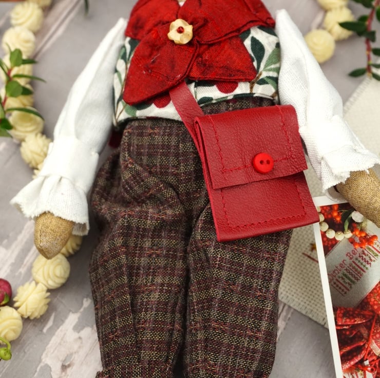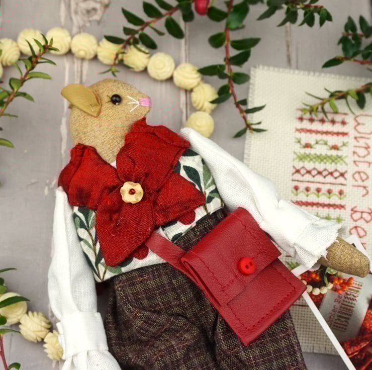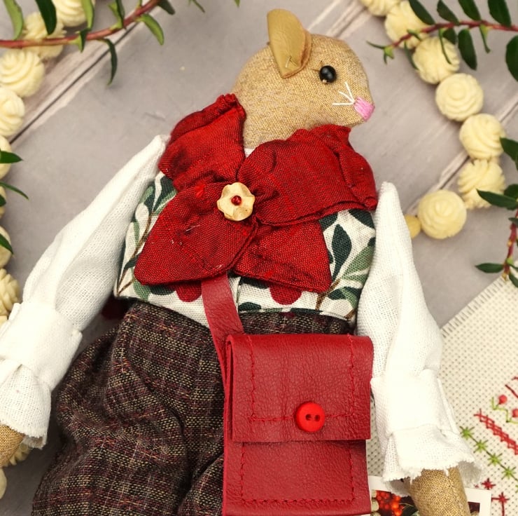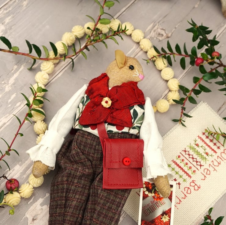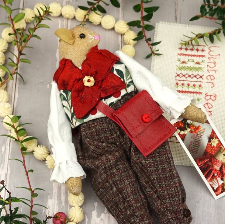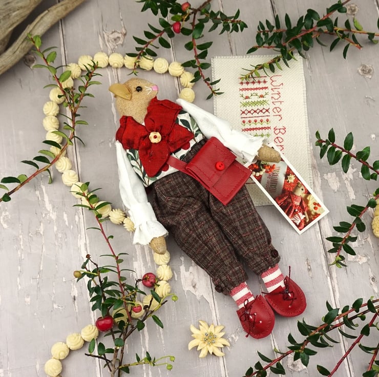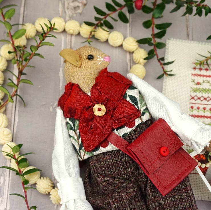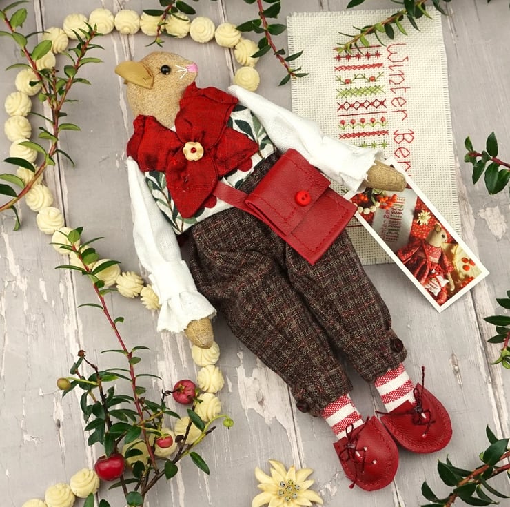 This is Artle, a tiny winter berry mouse. He is a hand embroidered mouse with little leather ears and tail. He is dressed in tweedy yarn dyed cotton plus fours with white linen shirt and a Winter Berry print cotton waistcoat. The print is called Winter Berry Arbutus by William Morris He is finished with tiny buttons, leather shoes and a little red leather bag to match his boots .