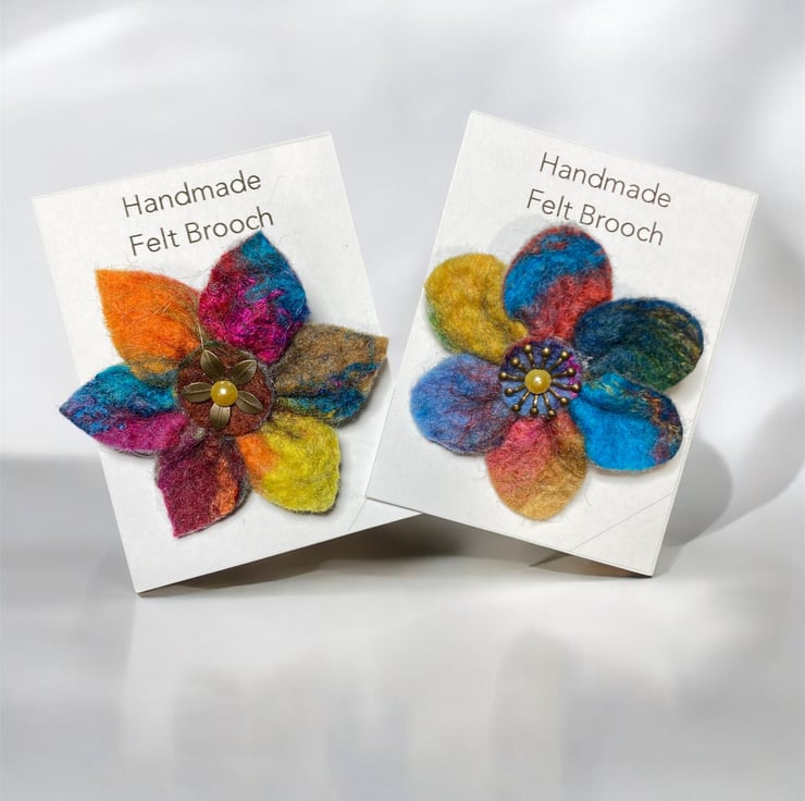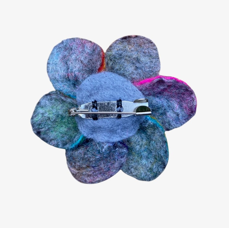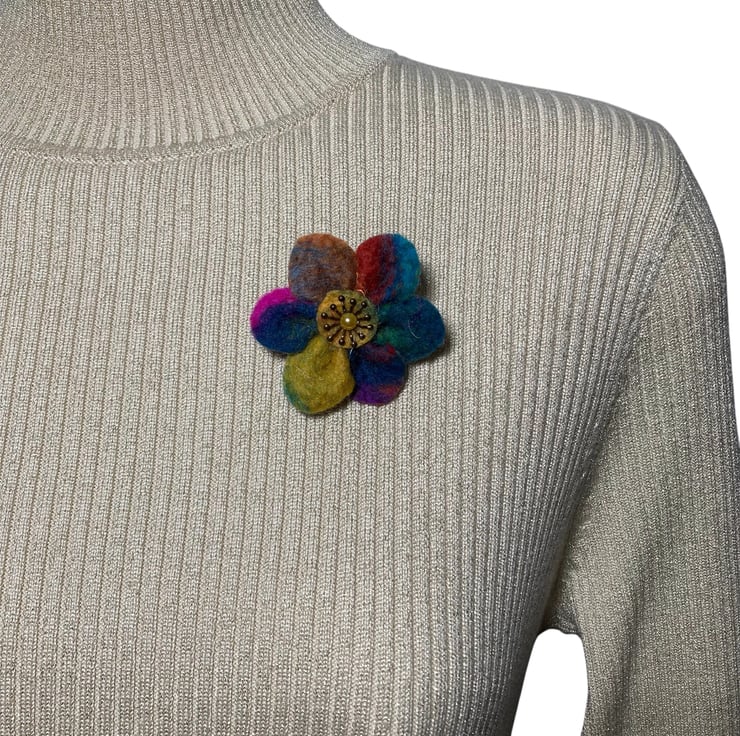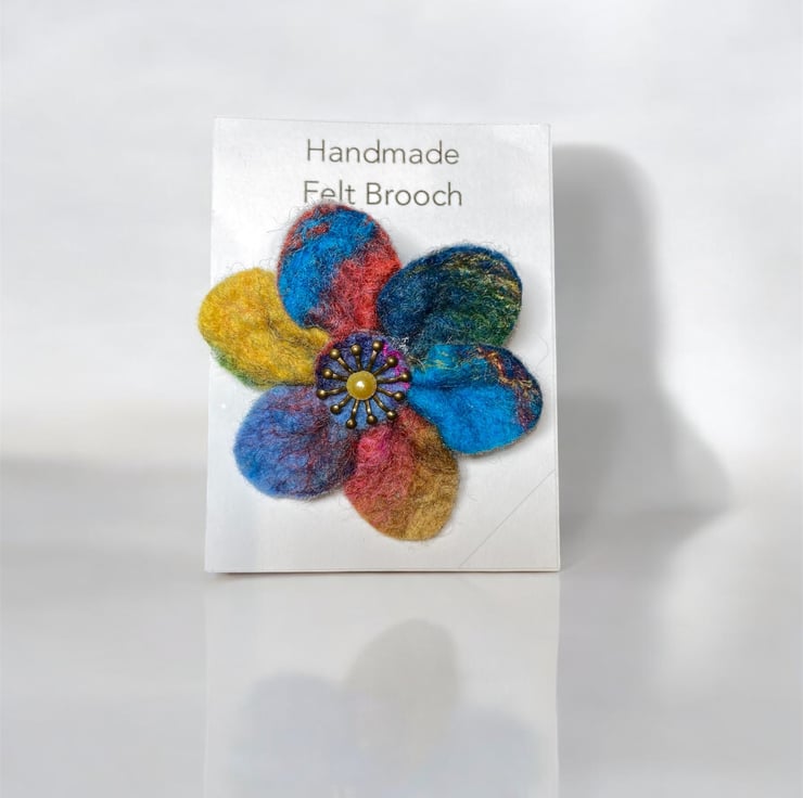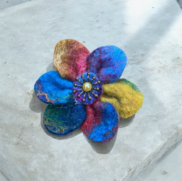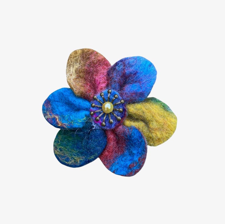 A beautiful bright flower brooch to brighten up any outfit. This flower brooch has been made from a piece of hand felted multicoloured felt. The felt has been made using brightly coloured merino wool and silk fibres,The flowers have six rounded petals with a central antique brass effect stamen and golden yellow acrylic half pearl added. A silver tone brooch pin has been securely attached to the reverse.