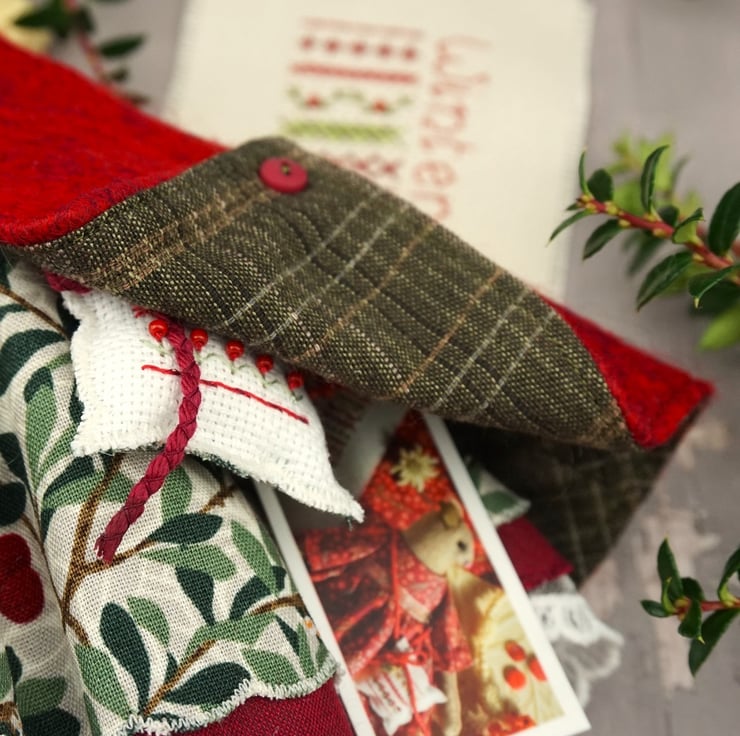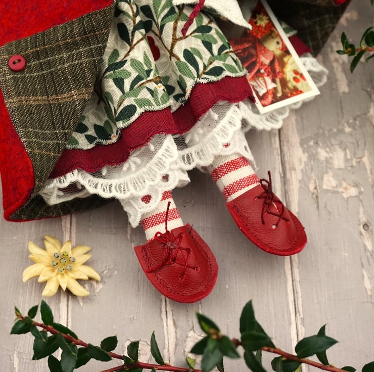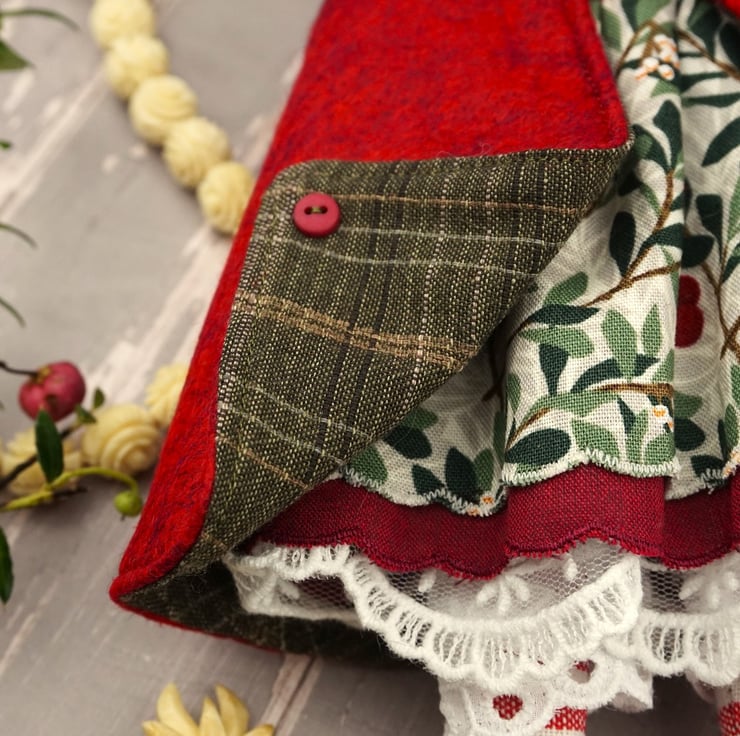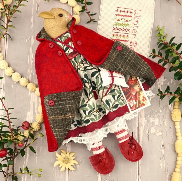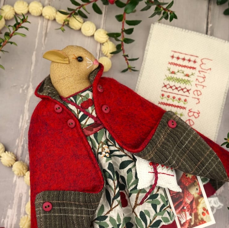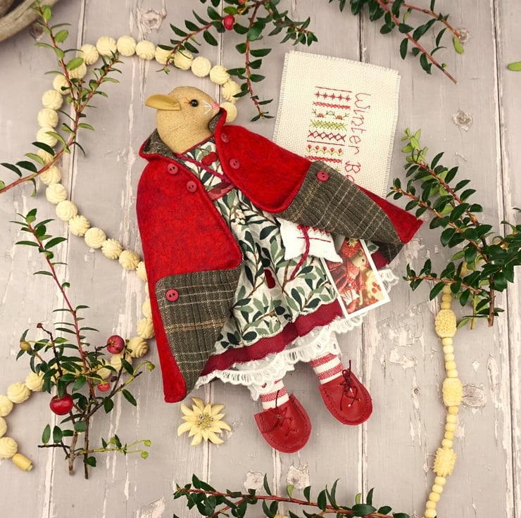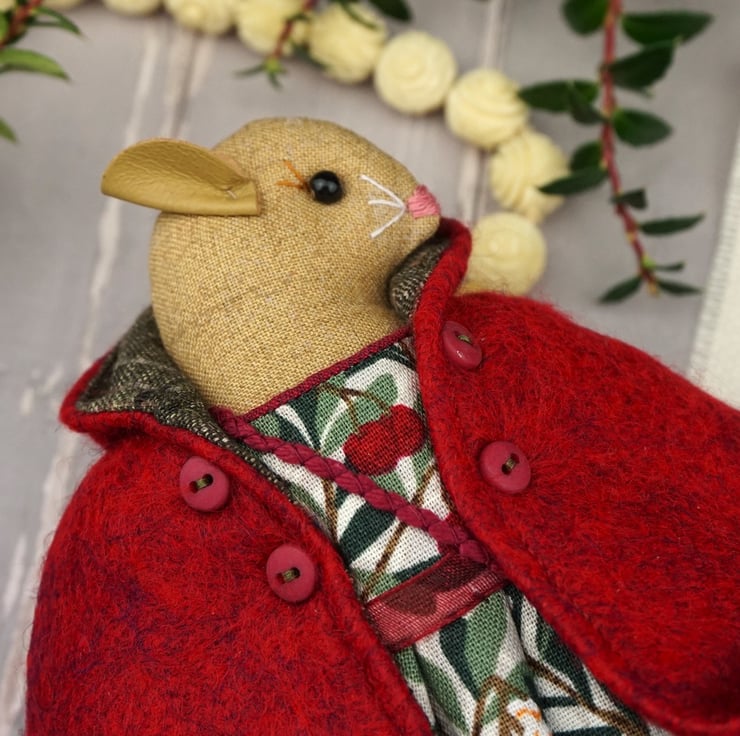 This is Greta, a tiny winter berry Christmas mouse in a wool cape. She is a hand embroidered mouse with little leather ears and tail. She is dressed in a Winter Berry print, a white ground with berries in a range of reds with varying colours of evergreen leaf. The print is called Winter Berry Arbutus by William Morris She has coordinating underskirts in burgundy shot cotton, white tulle mesh and white cotton lace bloomers. To keep warm she has a wool cape lined with a Japanese yarn dye cotton in green to pick up the green in her dress. Her dress is finished with organza ribbon, tiny buttons and little leather shoes. She is a brown mouse with brown ears, a pink tail with white whiskers and a pink nose with little black bead eyes.
