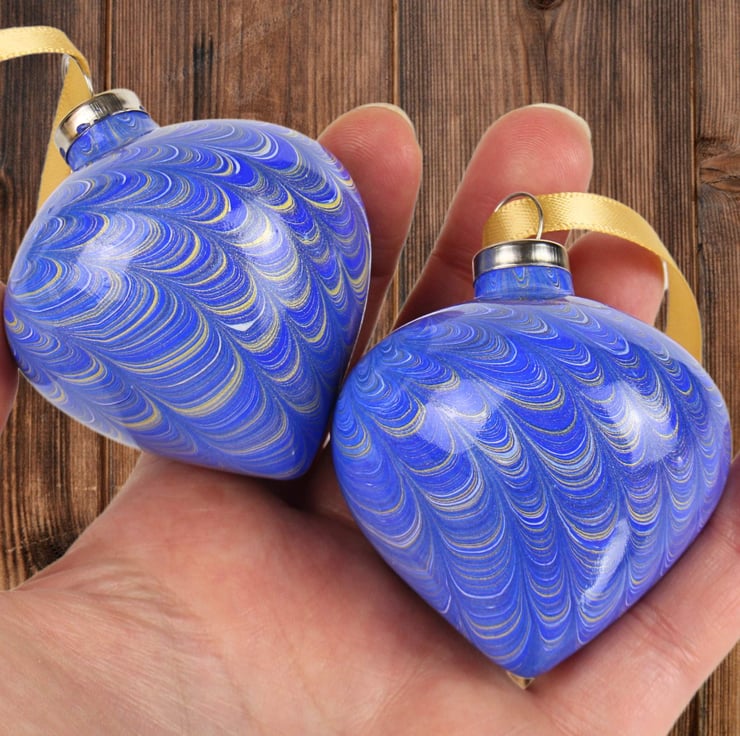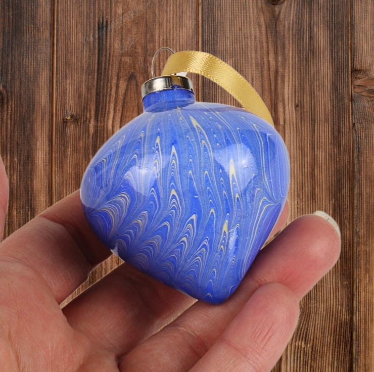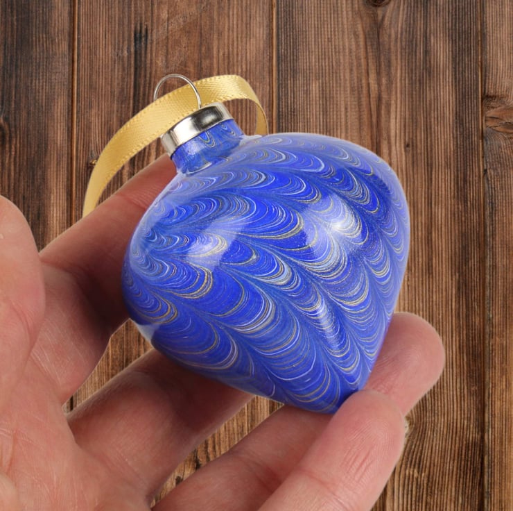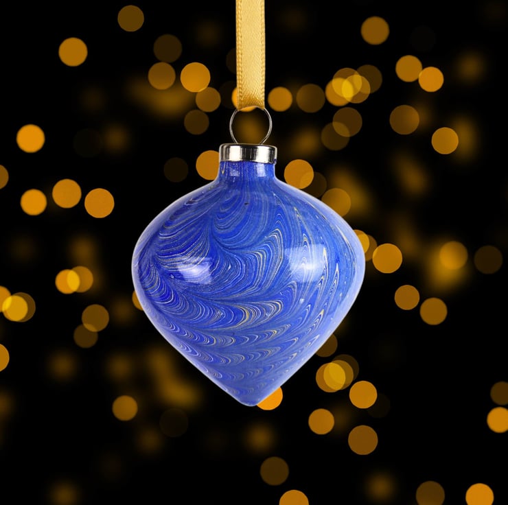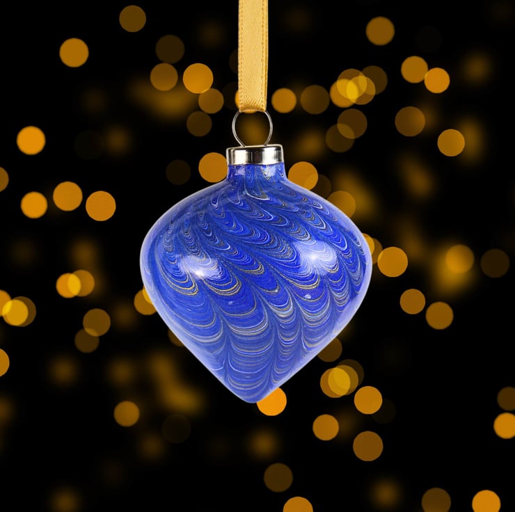 Ceramic Christmas bauble blue and gold nonpareil drop shape hand marbled