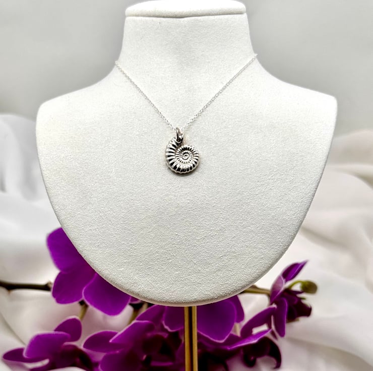 Fine Silver pendant and chain. I have handmade this necklace using eco-friendly silver metal clay. I created a silicone mould of an ammonite I found on Whitby beach, used this to make a silver cast with the metal clay, refined and then kiln fired. The result is solid 999 fine silver. The cast ammonite is created and refined by hand, resulting in a bespoke one of a kind piece.