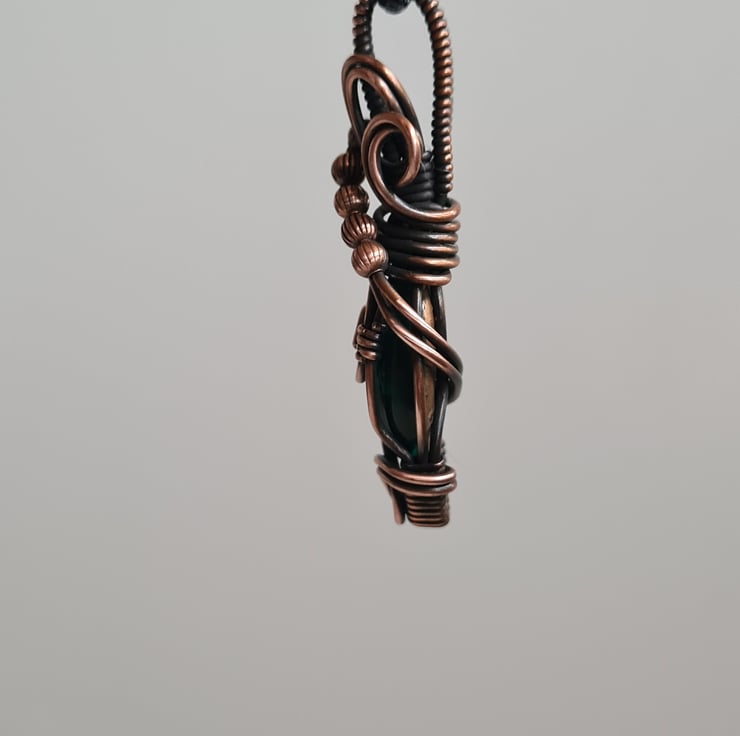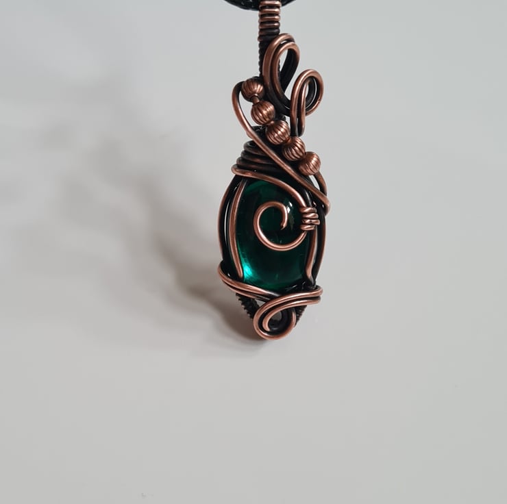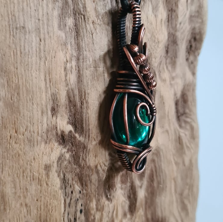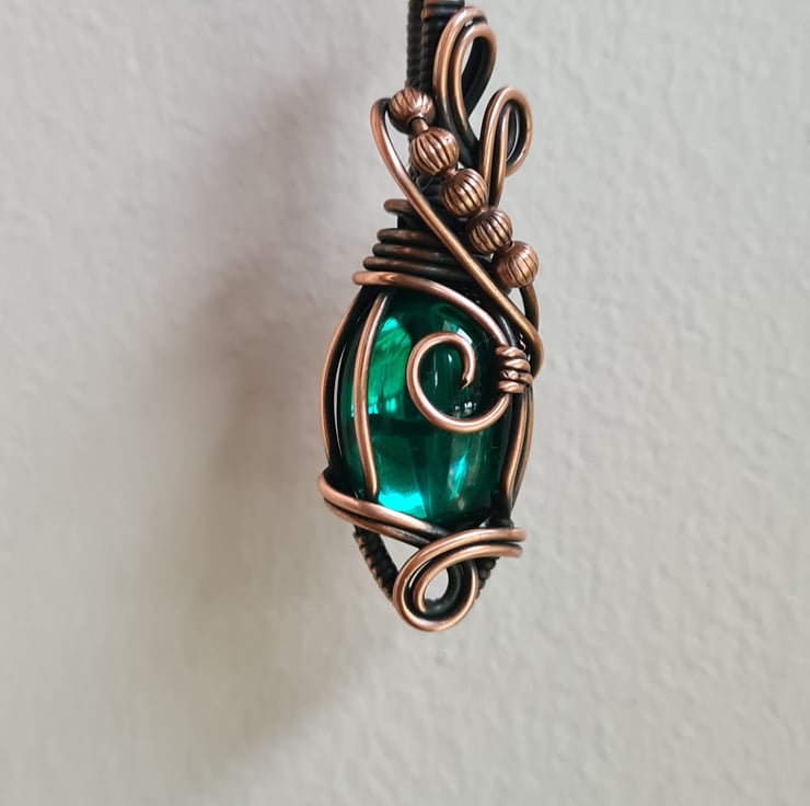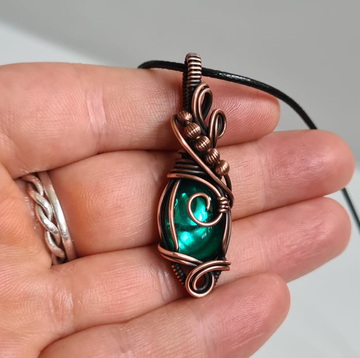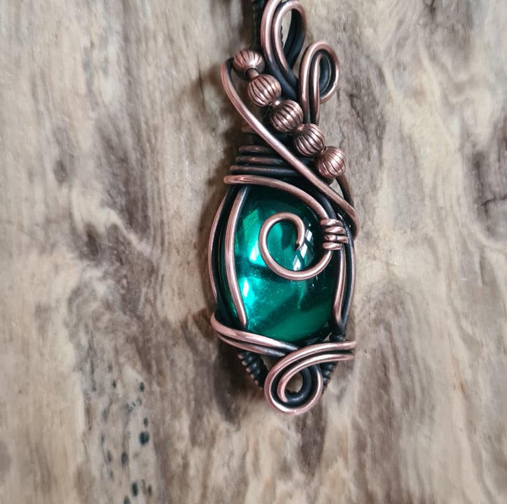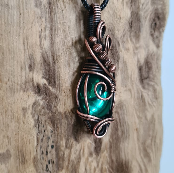 I have taken this gorgeous and bright, foil backed, teal/green coloured glass cabochon and hand wrapped it in raw copper, which I have then antiqued and polished for the final effect.