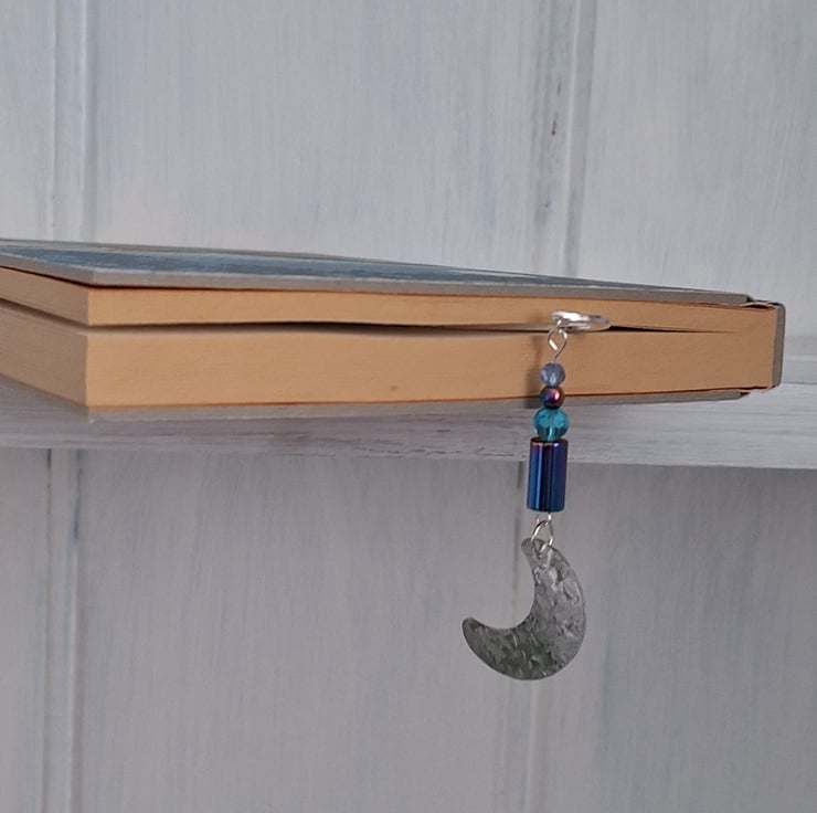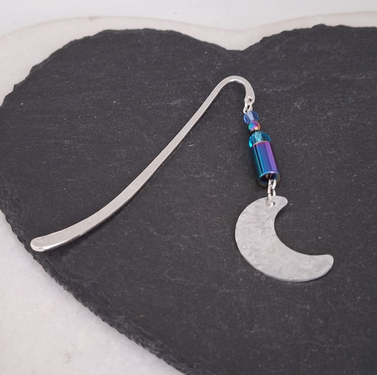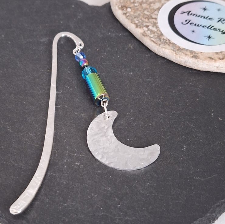 I have hammered the lightweight silver tone metal bookmark both sides and selected an assortment of Rainbow coloured Hematite and coloured glass beads to elevate this bookmark- then a finishing touch of a hammered Crescent Moon aluminium charm.