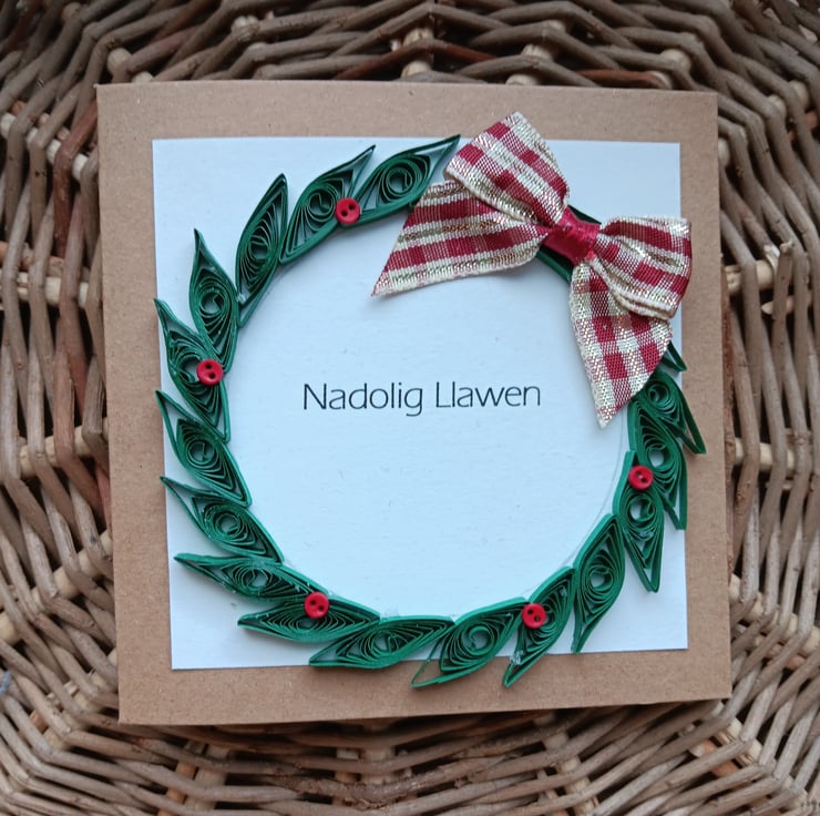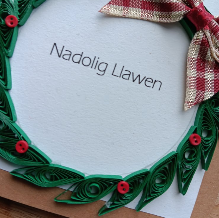 This small card is handmade with love and care using quality materials : brown kraft card, dark green quilling paper, a tartan bow and tiny red buttons. The words Nadolig Llawen (Happy Christmas) are printed on white sketching paper. The card is fairly small but raised so if posted you need to bear in mind that the postage will be for a large letter.