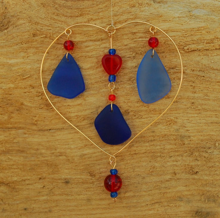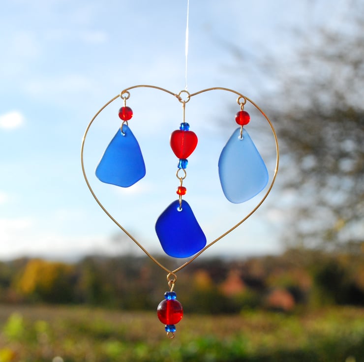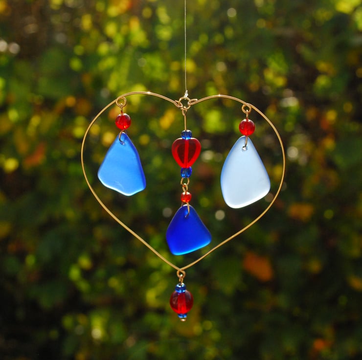 Our sun catchers are individually hand made in Chudleigh, Devon. We collect our materials ourselves, mainly from local beaches. Each piece of glass is unique, so each sun catcher is unique. We only use materials which have rounded edges, which is why we tumble pieces which have rough edges (this continues the process begun by the waves) until they are smooth.