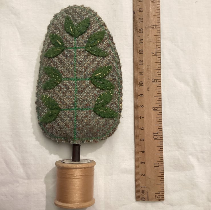 A lovely classic wool tweedy fabric with free motion stitching and hand appliqué leaves. I love these fabrics and how the simple shapes compliment each other to create an interesting collection of trees.