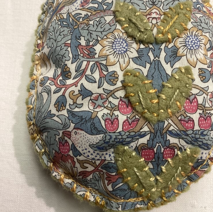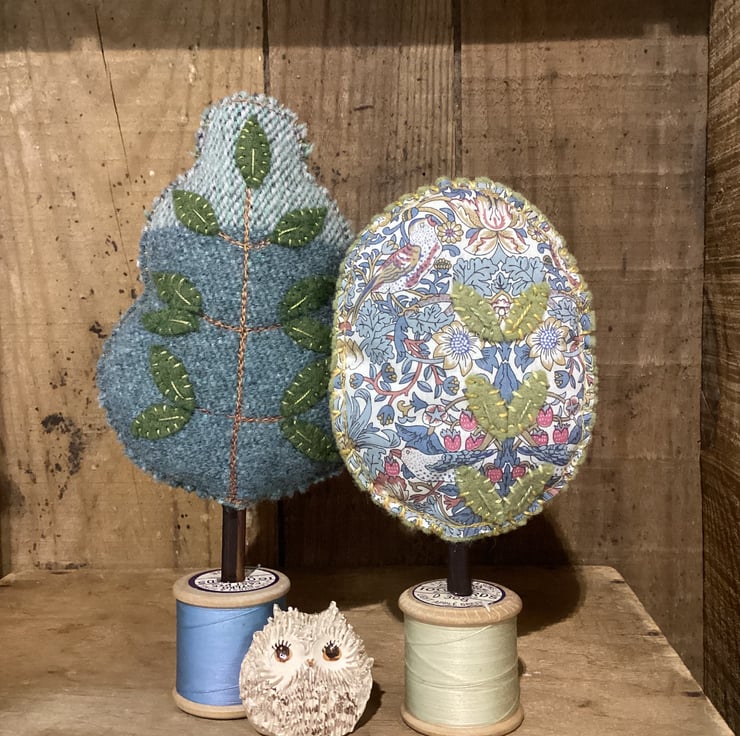 with hand embroidered appliqué leaves. When I found this fabric in the right scale I just had to make some trees, the colour ways and details are beautiful, I hope the offset leaf appliqué enhances those naughty little birds hiding in the print!