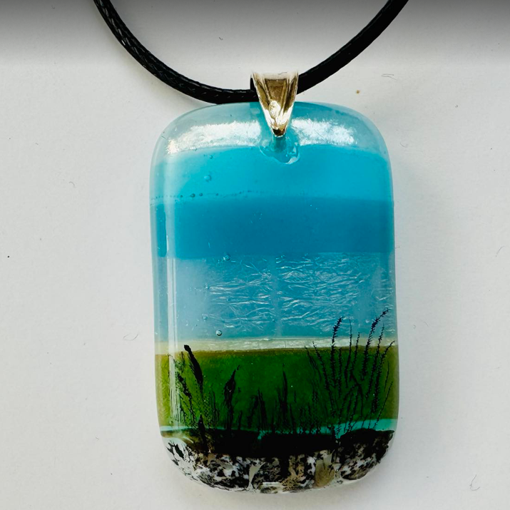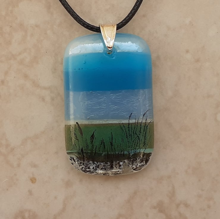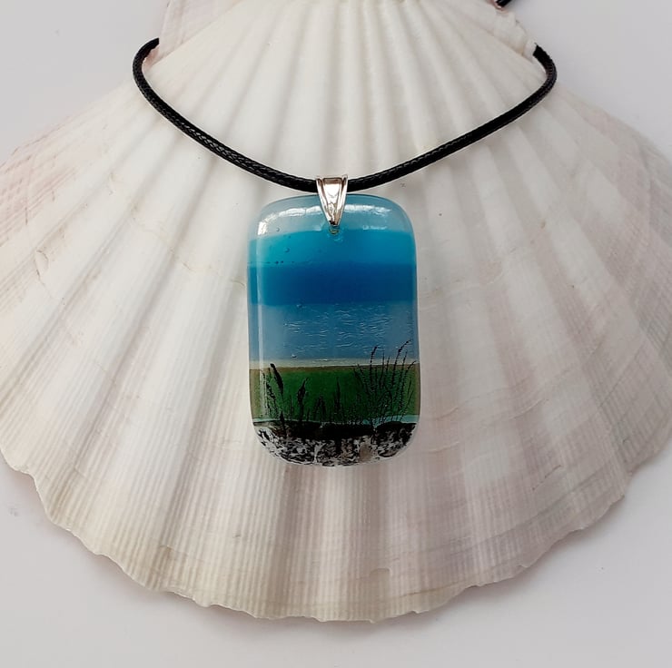 Fused glass pendant necklace depicting a seascape. Created by layering up narrow strips of carefully colour graded art glass to represent a rocky shore set before a sparkling sea and vivid blue sky. The strips were fused to a white base and kiln fused, then refined by hand-sanding before adding more detail to represent the grasses in the foreground and fusing again. A statement piece of jewellery, measuring 25 x 40mm, the pendant has been drilled and fitted with a sterling silver bail and adjustable black neck cord (adjustable between 17 - 19")