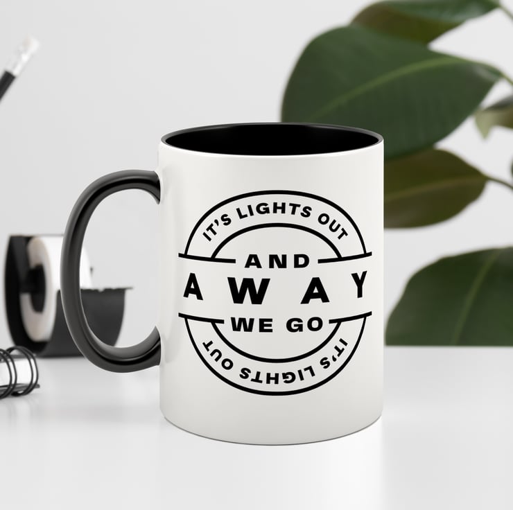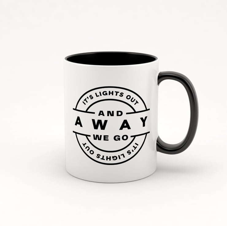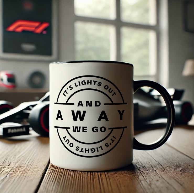lChannel the thrill of a Formula 1 race start every morning with this sleek and minimalist "It's Lights Out and Away We Go" mug! Designed for F1 enthusiasts, this mug features a modern, circular layout of the iconic start quote, adding a clean and stylish touch to your coffee or tea routine. With a black handle and interior, this mug is the perfect blend of simplicity and racing spirit, making it a great addition to any motorsport fan's collection.