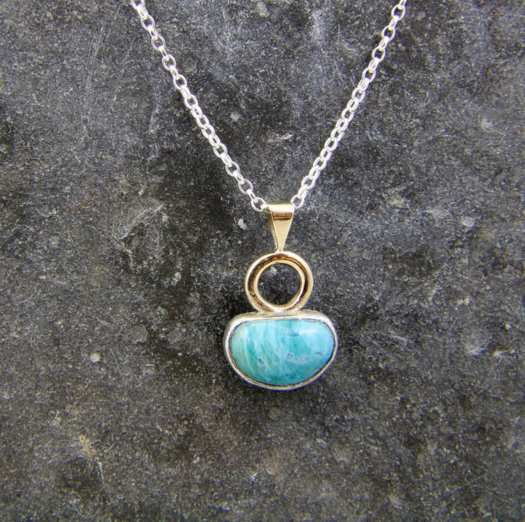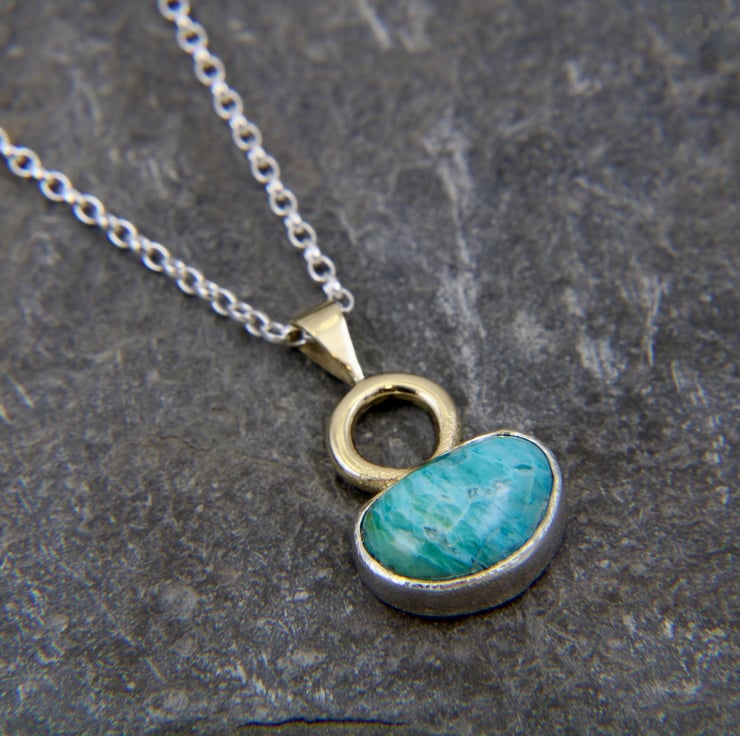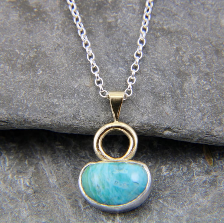 The irregular semi circle shaped Turquoise gemstone has been set in a Sterling Silver Bezel style setting. The bezel setting carries a fine texture detail that reminds me of reflections on wet sand. A chunky 9ct gold hoop attaches to the bezel, half textured and half polished represents the setting sun. The bail is 9ct Gold, fixed and shaped to represent a sunbeam. The pendant measures approx 2.9cm tall and 1.4cm at its widest point and is presented on a Belcher style chain, length of your choice.