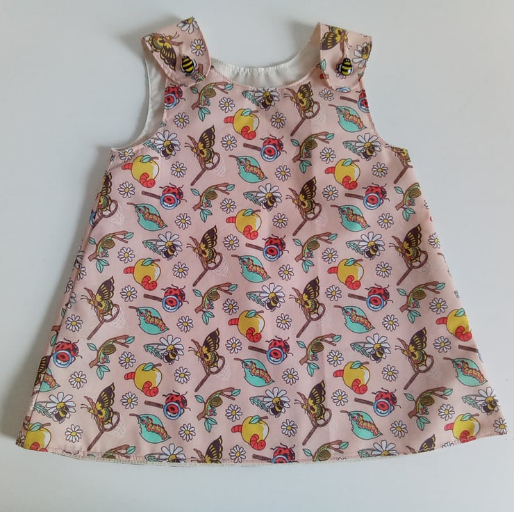 A line style summer dress/ pinafore with an insect/bugs design print. Fully lined in a cream polycotton.