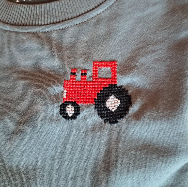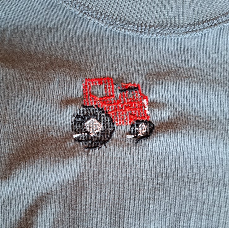 The tractor motif has been very popular for many years. I first designed it for the four year old son of a friend, who asked me to stitch his Daddy's tractor. He was bitterly disappointed when I embroidered a red one, as Daddy's tractor was a John Deere!