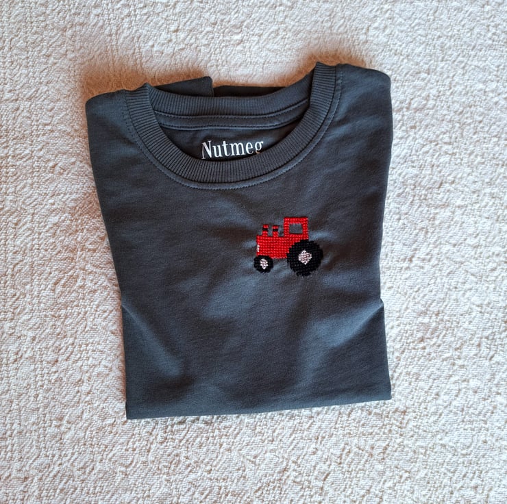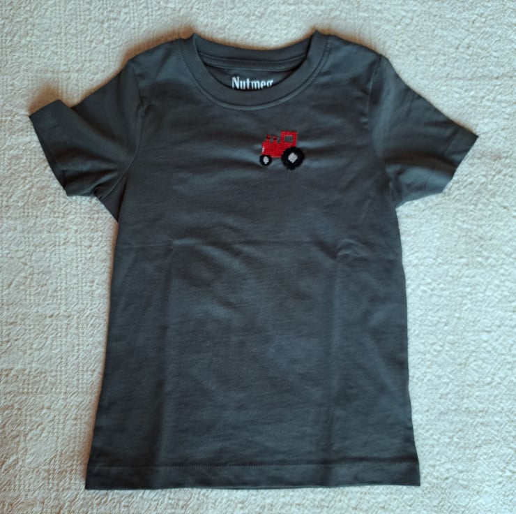 I have hand embroidered a bright red tractor on the left breast of this dark olive-green T-shirt. The shirt has short sleeves and a round neck. As I never use a permanent backing fabric when hand embroidering kids' clothing, there is nothing inside to irritate your child's skin. The shirt is all cotton, and can be machine washed.