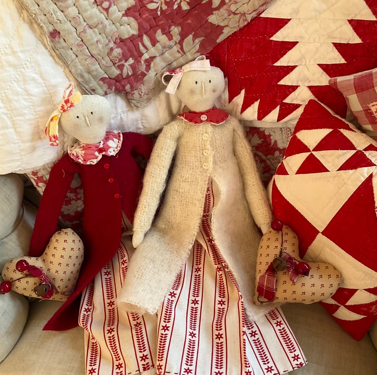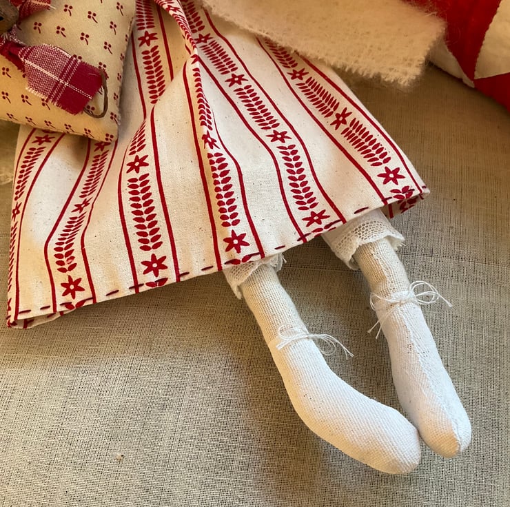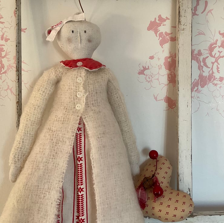 She comes with a primitive heart, trimmed with faux berries, tied homespun bow, and rusty bell, which just sits in her lap whilst seated.