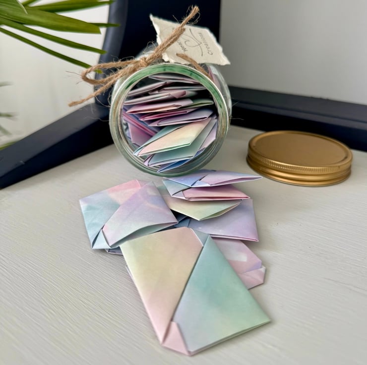 The jar has been hand painted, and each affirmation has been folded and tucked inside an origami envelope made from paper in gentle, pastel tones - this jar of affirmations has been thoughtfully created with love and care.