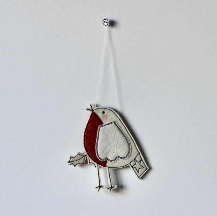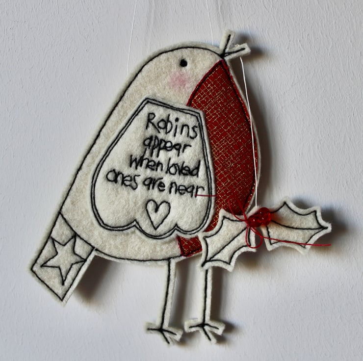 With a red breast, Mr Robin has a star on his tail, holly with glass bead berries suspended from his beak and the sentiment 'Robins Appear when Loved Ones are Near' sewn on his wing.